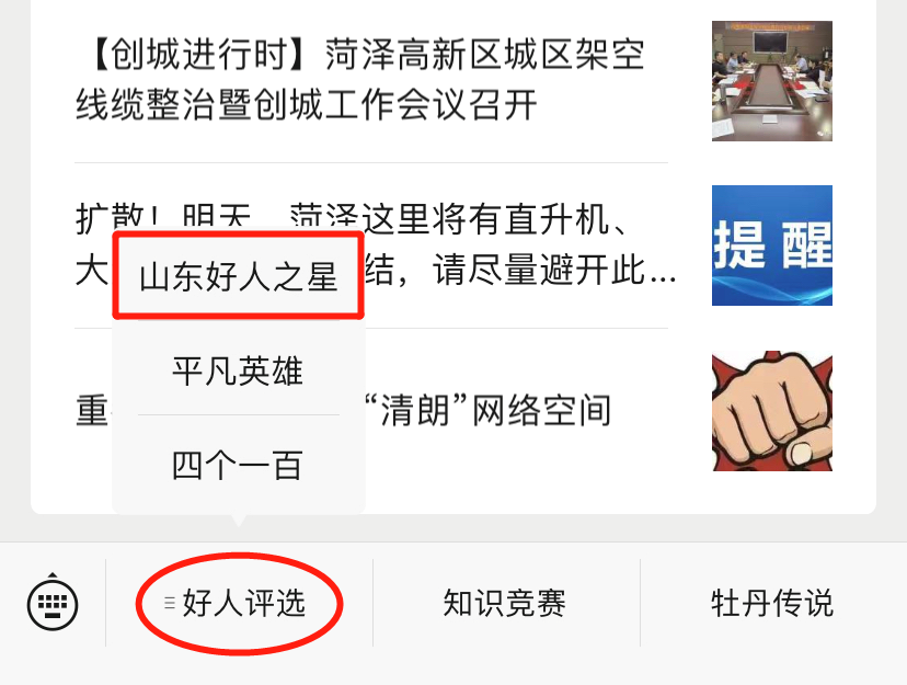2、关注“文明菏泽”微信公众号,点击公众号底部菜单栏“好人评选”――“山东好人之星”,为菏泽候选人投票。