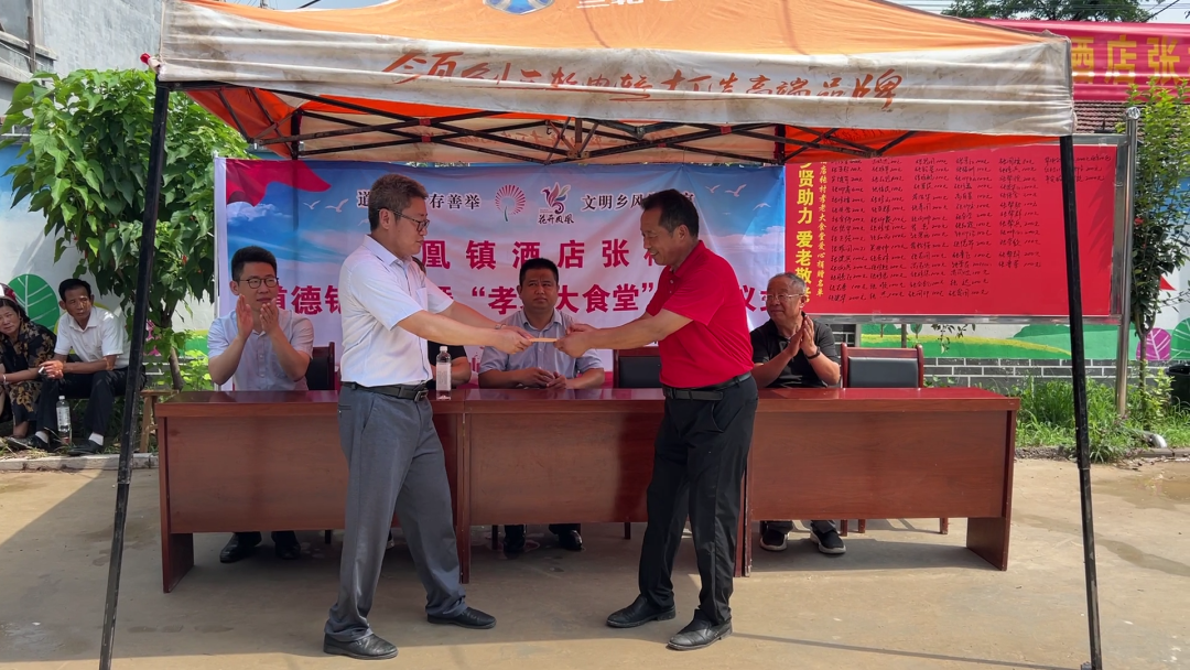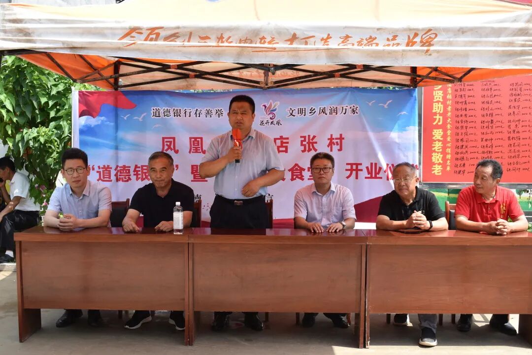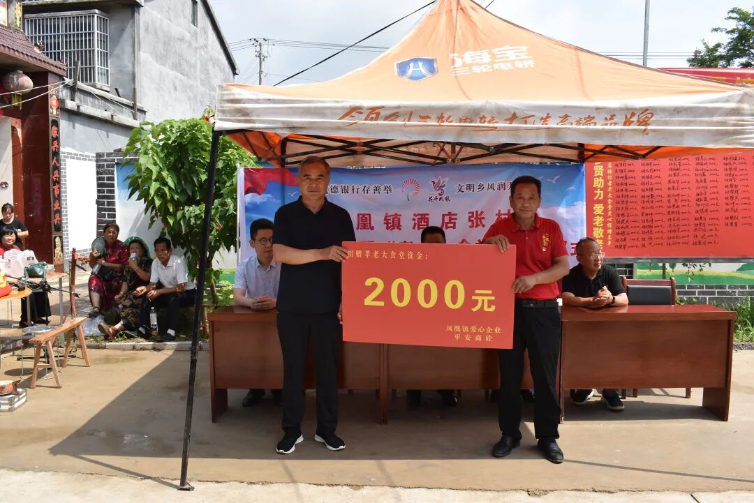 在开业仪式上,凤凰镇党委副书记、镇长孙福川向大家介绍了道德银行及孝老大食堂运转理念,代表镇党委向酒店张村颁发活动启动资金,爱心企业平安砼业企业负责人和华电集团项目负责人分别进行了现场捐款。