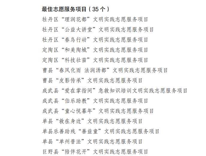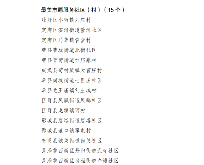 为深化“五为”文明实践志愿服务,大力倡树美德健康新生活,持续发挥先进典型的示范引领作用,市文明办、市总工会、团市委、市妇联、市科协、市社科联、市文联、市残联、市红十字会、市民政局、市生态环境局、市农业农村局、市文化和旅游局、市卫生健康委、市退役军人事务局、市应急管理局、市国资委联合组织开展菏泽市2023年“五为”文明实践志愿服务先进典型推选活动。活动于11月份启动,经层层选拔推荐、严谨审核评议、专家评委评定,推选出最美志愿者100名、最佳志愿服务组织50个、最佳志愿服务项目35个、最美志愿服务社区(村)15个。为体现公平、公正、公开的原则,现面向社会予以公示,广泛征求各界意见,接受群众监督。