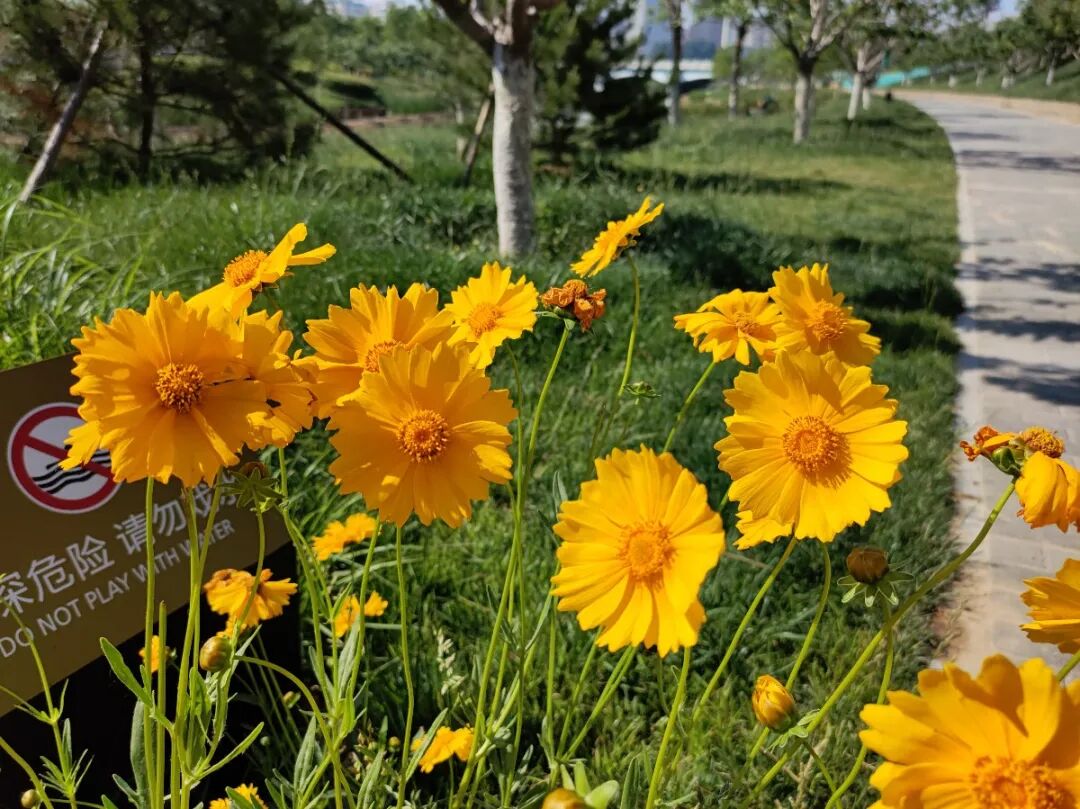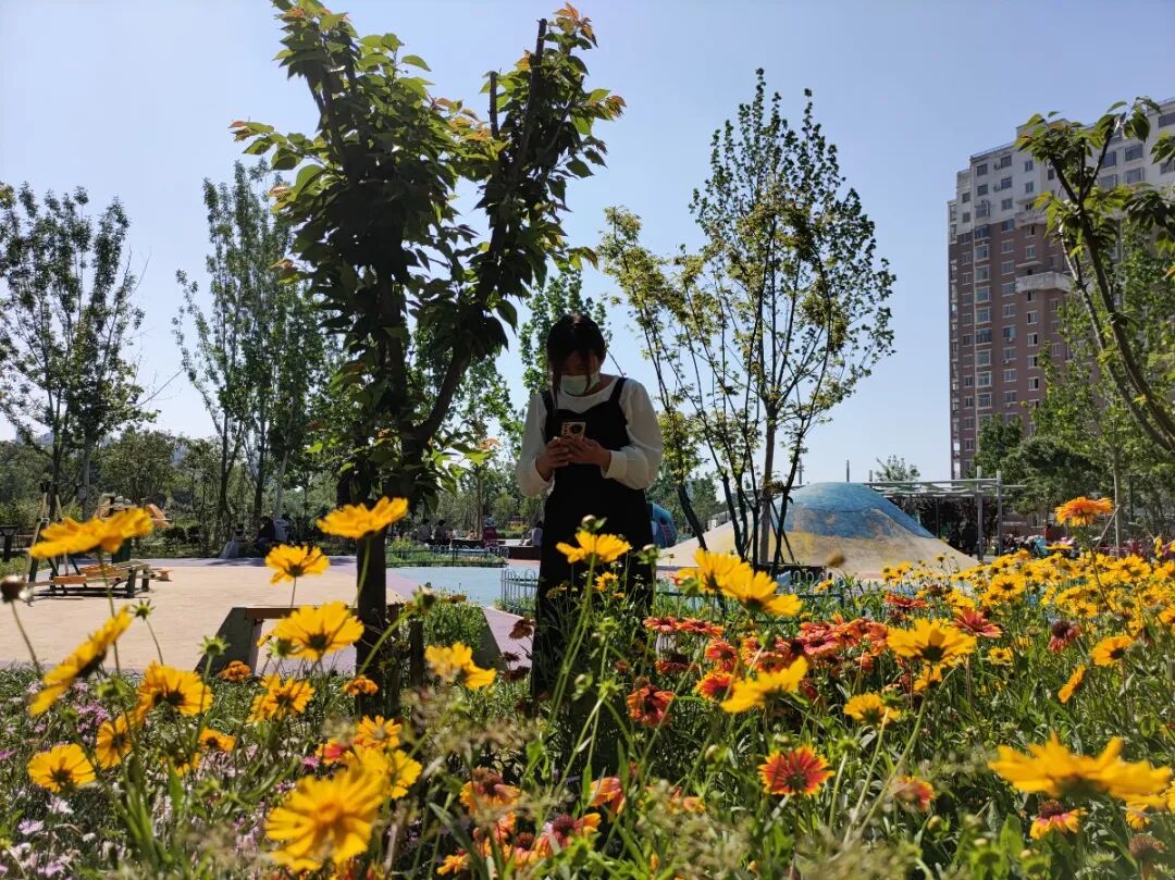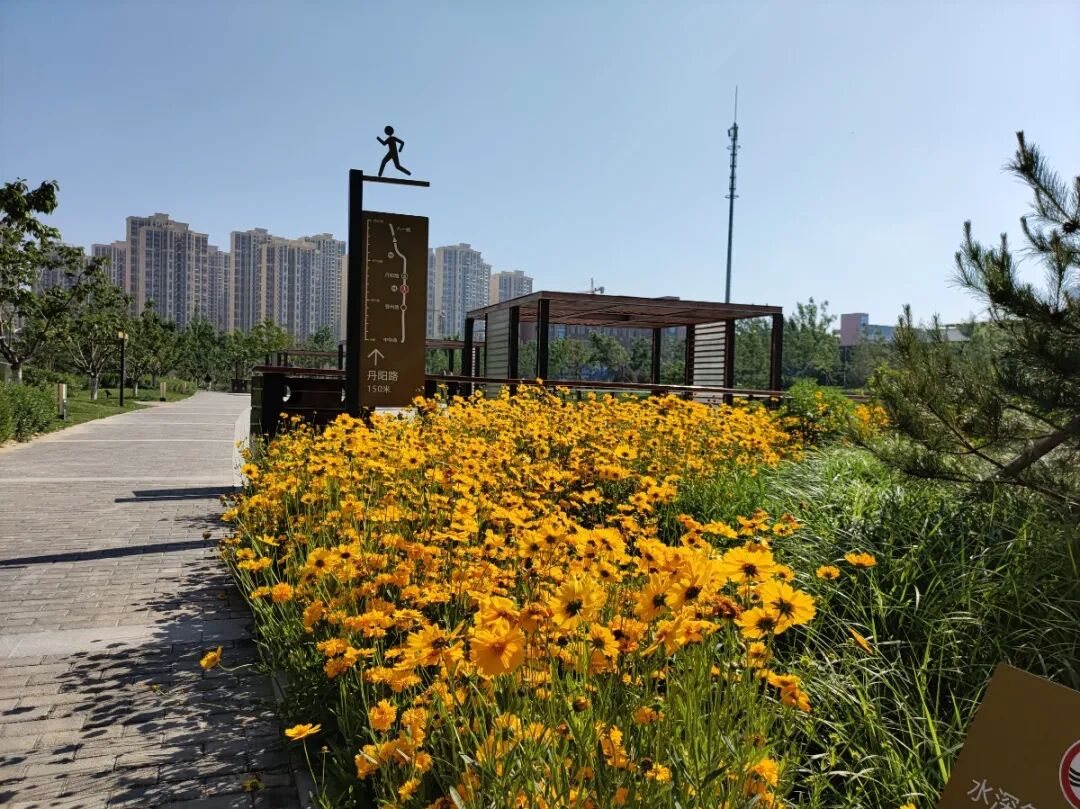 公园内不仅有栽植整齐的树木遮阳,而且路边多种不知名的小花竞相开放,一下子就点缀了满眼的绿,煞是好看。公园内树木众多,空气清新,成为一处天然的氧吧,在这里待的时间久了会让人感觉到身心舒畅,烦恼全部排空。玩累了的话,游人可以坐在特色木制桌凳或长椅,或者一个个造型独特的亭子中休息。