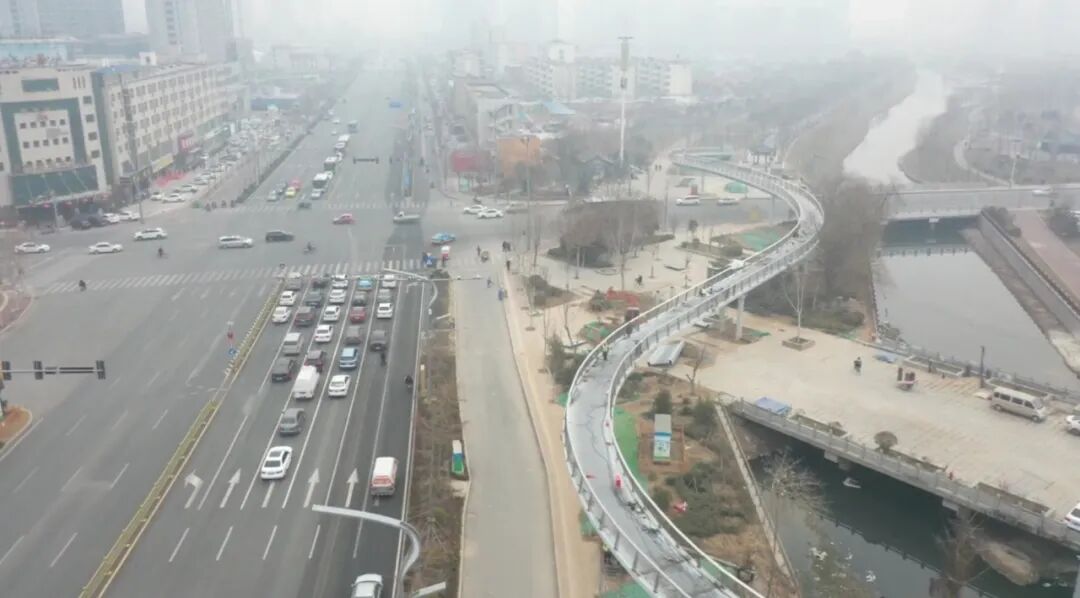 据了解,中华路与点将台路天桥总长度561.5米,也是目前菏泽市已建成的最长人行天桥。北起中华西路北侧环堤公园点将台公园段堤顶路,东至点将台路东侧环堤公园湿地公园段堤顶路,呈现S行横跨中华路与点将台路之间,是环堤公园工程的重要部分。
