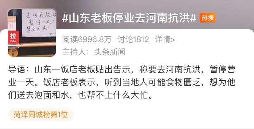 菏泽一小饭店老板贴告示暂停营业一天:去河南抗洪,等我回来!