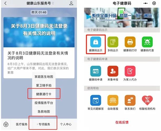 “两码一证”均可在长按或扫描下方二维码,点击下方“专项服务”-“健康通行卡”-“健康码出示”,即可查看电子健康码以及行程和疫苗接种证明。