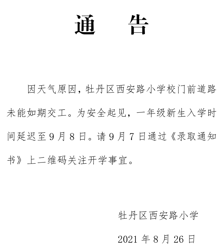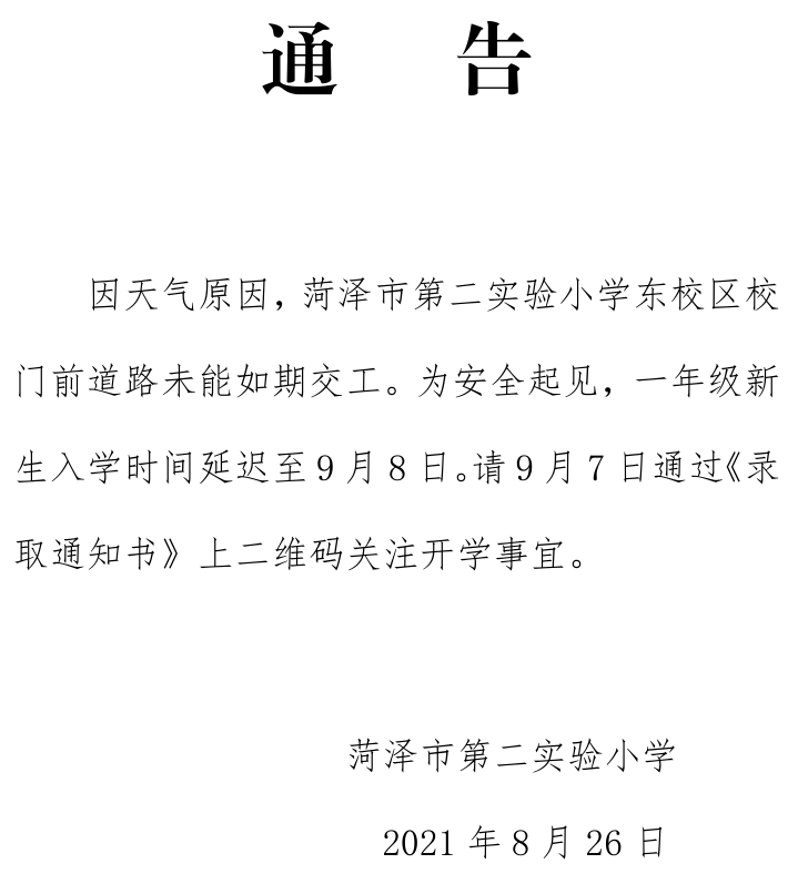 关于菏泽市第二实验小学一年级延迟开学的通告
