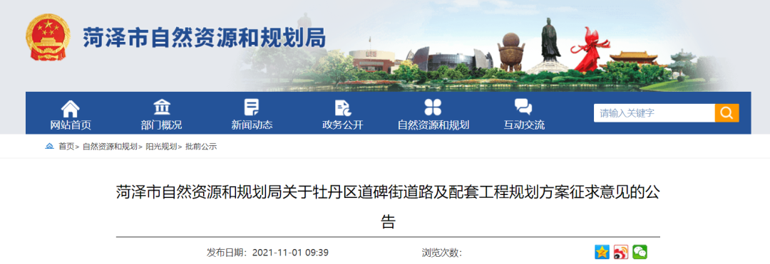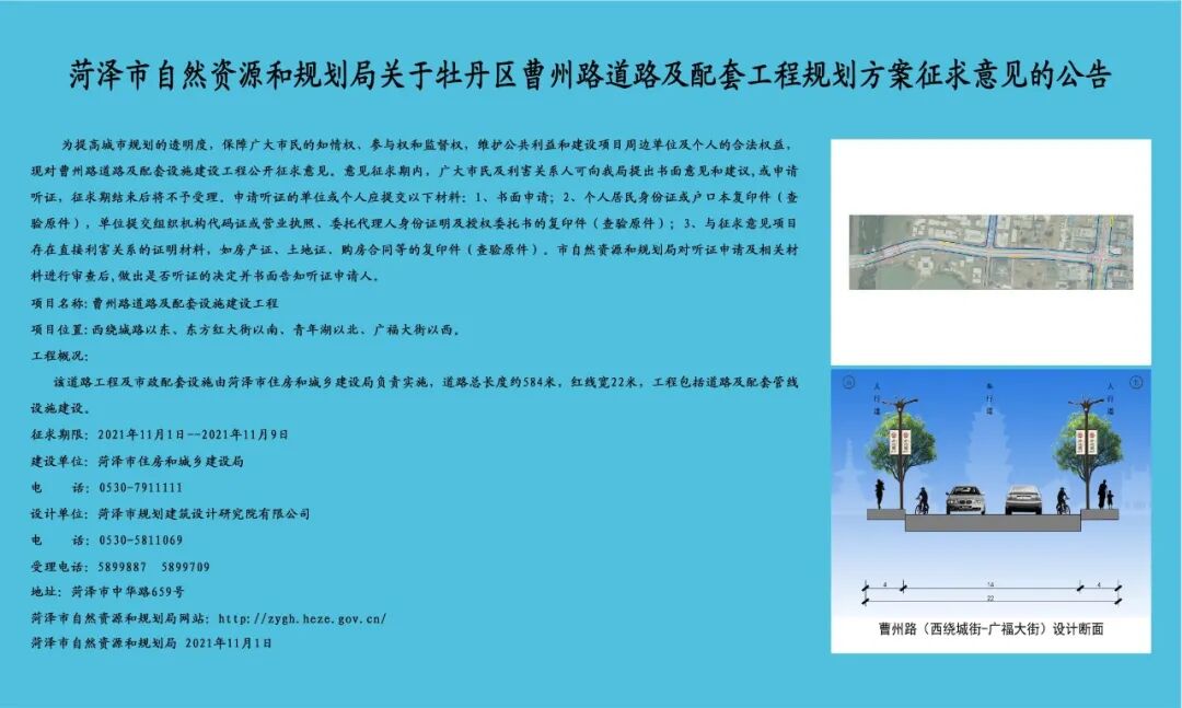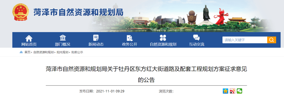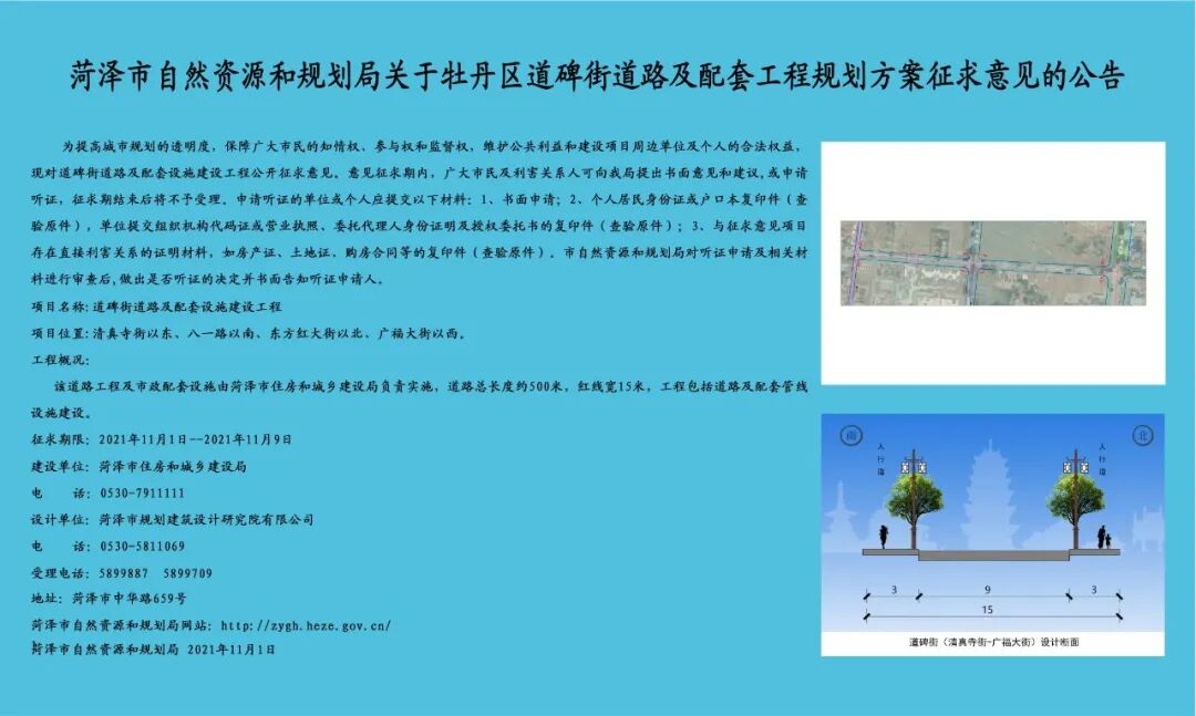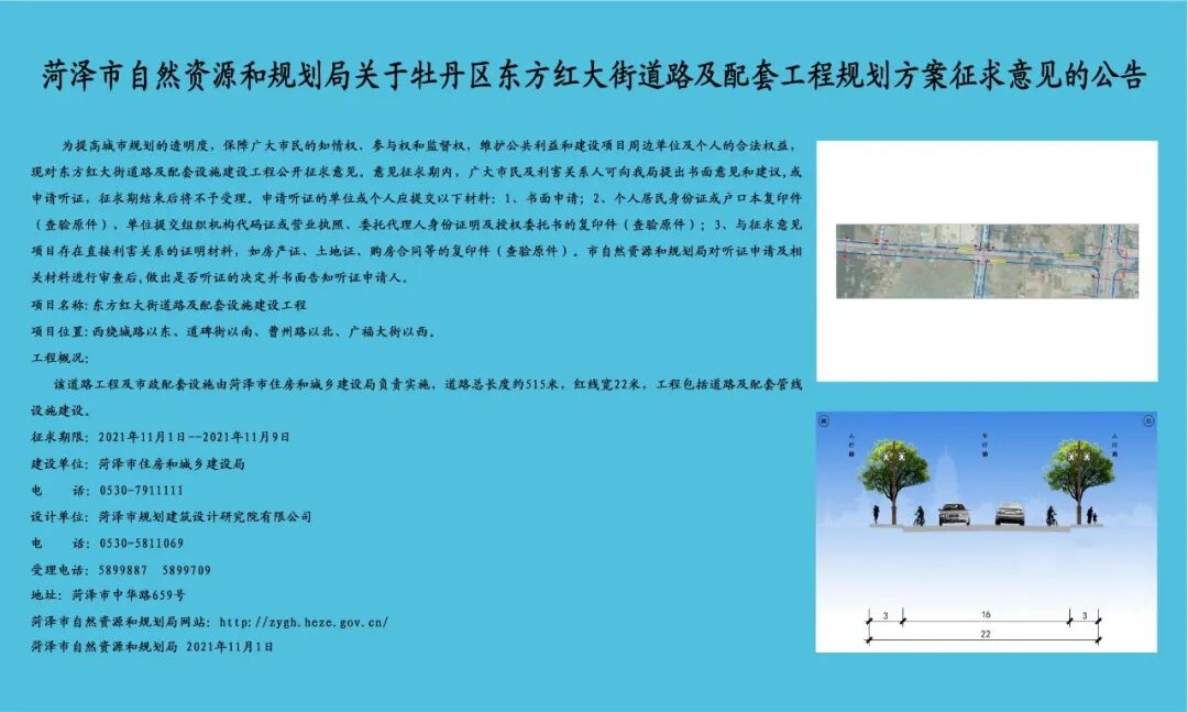 日前,菏泽市自然资源和规划局网站发布了《关于牡丹区东方红大街道路及配套工程规划方案征求意见的公告》《关于牡丹区曹州路道路及配套工程规划方案征求意见的公告》《关于牡丹区道碑街道路及配套工程规划方案征求意见的公告》。具体内容如下: