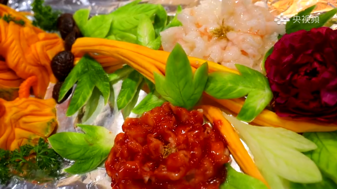 这道花开盛世选用明虾炸制成花瓣形状,