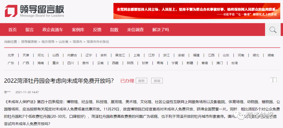 《未成年人保护法》第四十四条规定:博物馆、纪念馆、科技馆、展览馆、美术馆、文化馆、社区公益性互联网上网服务场所以及影剧院、体育场馆、动物园、植物园、公园等场所,应当按照有关规定对未成年人免费或者优惠开放。11月29日,故宫博物院已经官宣将对未成年人免费开放,获得全国赞誉一片。同时,相比洛阳5个对公众免费的牡丹园和7个低收费牡丹园(20-30元,口碑极好),菏泽牡丹园收费高收费贵的问题广为诟病,也不利于菏泽开放的牡丹城市形象宣传。请问,2022菏泽牡丹园会考虑尝试向未成年人免费开放吗?