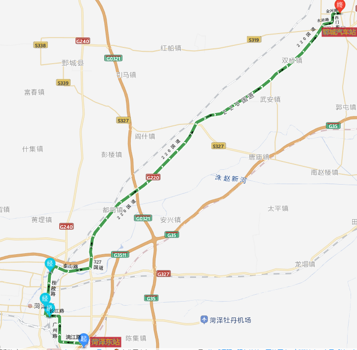 线路走向:菏泽东站-漓江路-广州路-长江路-桂陵路-黄河路-G327-G220-水浒路-西门街-金河路-郓城汽车站