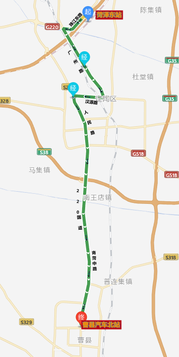 线路走向:菏泽东站-珠江东路-广州路-汉源路-人民路-G220-青菏中路-曹县汽车北站