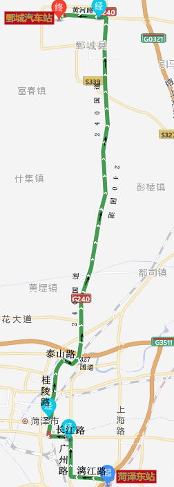 线路走向 :菏泽东站-漓江路-广州路-长江路-桂陵路-泰山路-G327-G240-黄河路-鄄城汽车站