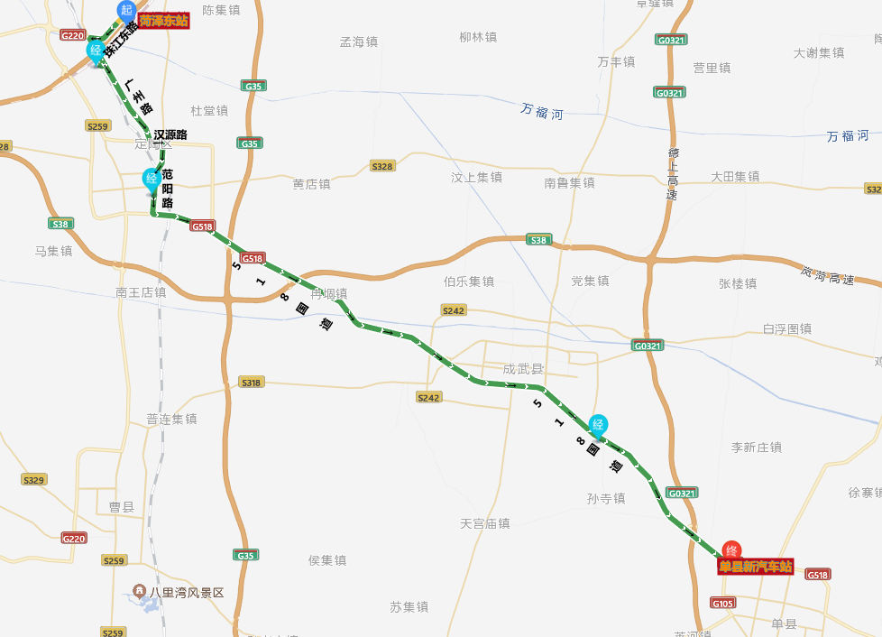 线路走向 :菏泽东站-珠江东路-广州路-汉源路-范阳路-G518-G105-单县新汽车站