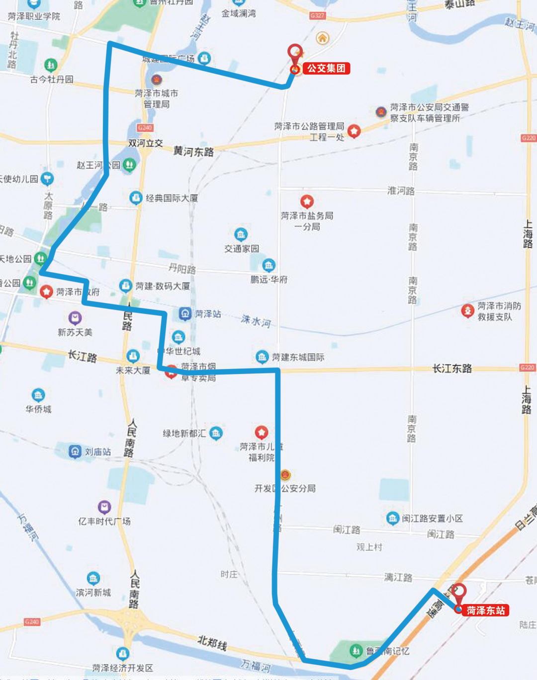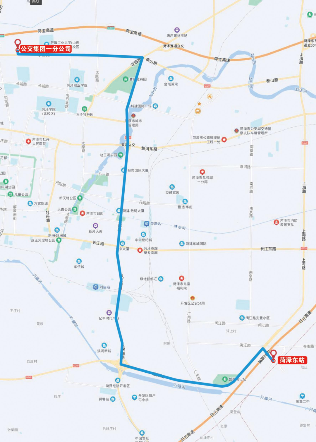 线路走向:公交集团一分公司―泰山路―人民路―珠江东路―G220―规划路―菏泽东站