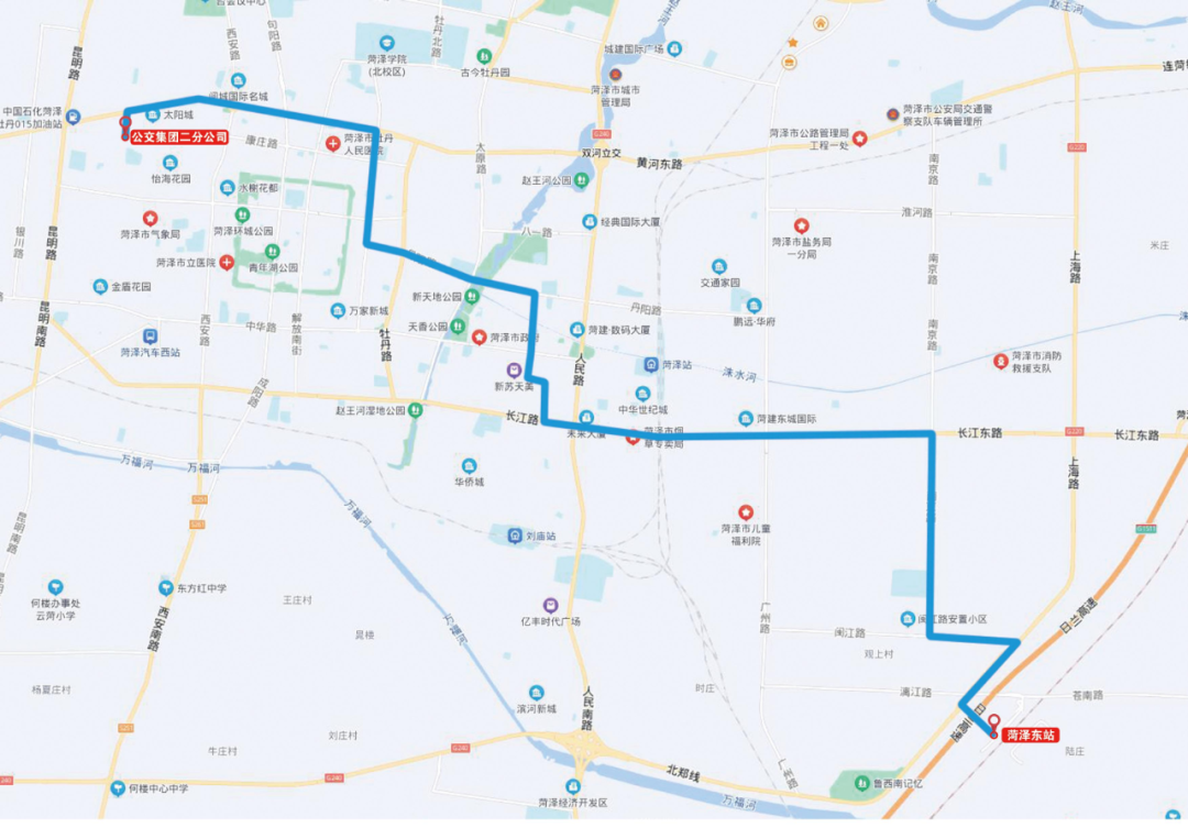 线路走向:菏泽东站-漓江路-广州路-长江路-桂陵路-黄河路-G327-五四路-东明汽车站