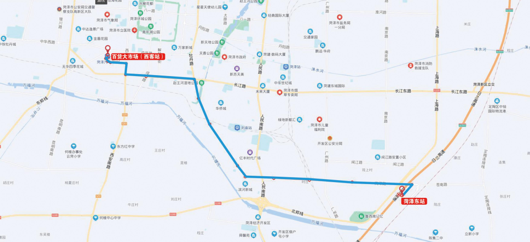 线路走向:百货大市场(西客站)―中山路―西安路―长江路―牡丹南路―漓江路―规划路―菏泽东站