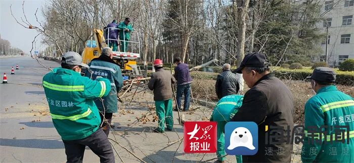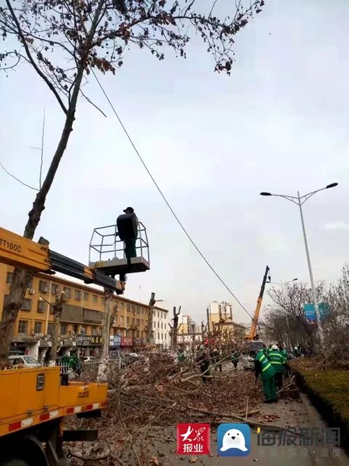 2月23日,在长江路的施工现场,菏泽经济开发区园林处的工作人员正各司其职,或对长江路两侧的树木进行修整,或搭乘工程车上升至树冠处,先修剪、清除树枝,再逐段将上半部分的树干锯断,路面上的部分工作人员则负责将伐下来的树枝和树干进行清理、装车,再将其转运到后方接收处。部分工作人员将被修整过的树连根挖出,横倒后用绳子将根部泥土捆绑固定,再次修建上半部分的树木枝桠,以便统一装车、运输。