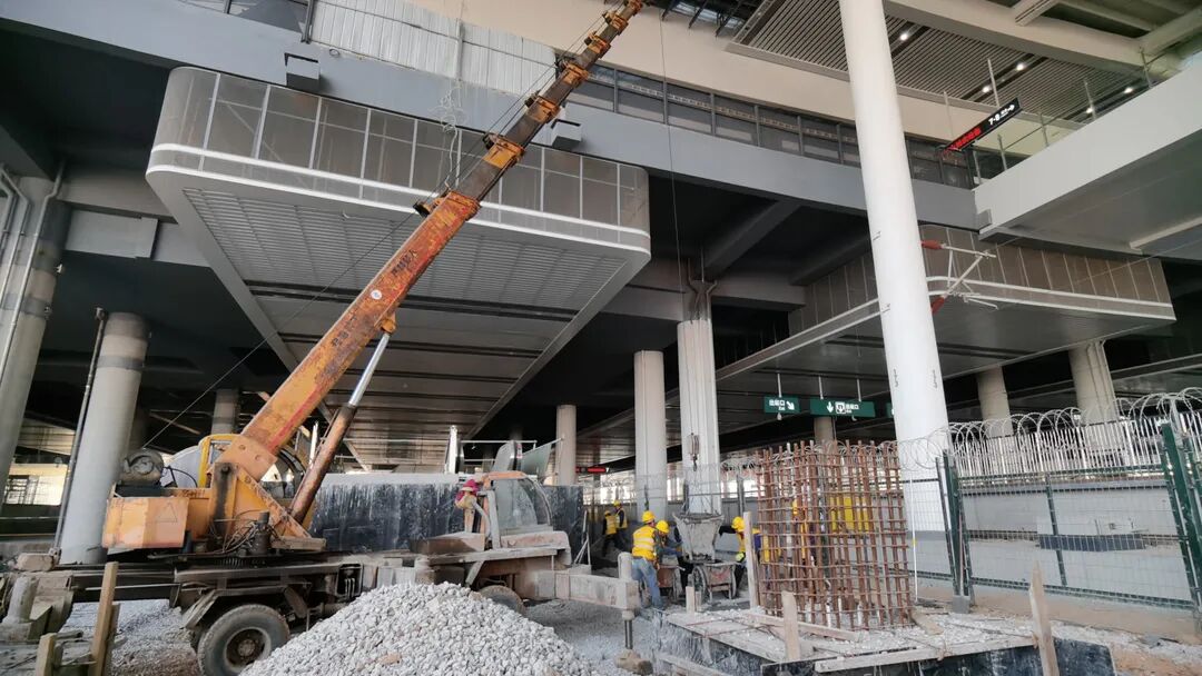 3月1日,记者走访施工现场时,在菏泽东站的站房北侧,工人正在配合混凝土搅拌运输车、吊车进行雄商场站台墙基础施工。