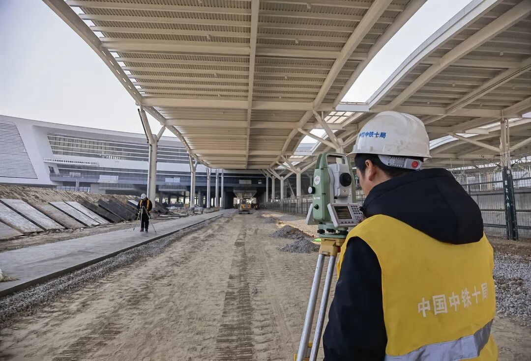 不远处,工程测量人员正操作仪器进行测量。站房南侧,数十名工人正在分工进行桩头调钢筋、站台墙垫层浇筑等。