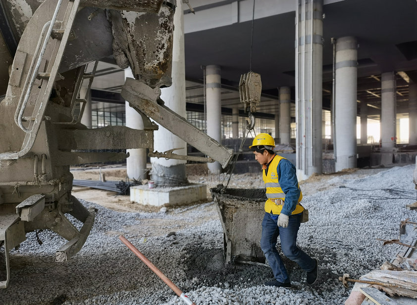 混凝土吊到上方后,两名工人立刻上手稳住容器,将混凝土倒入小推车内、推到一侧进行铺摊。