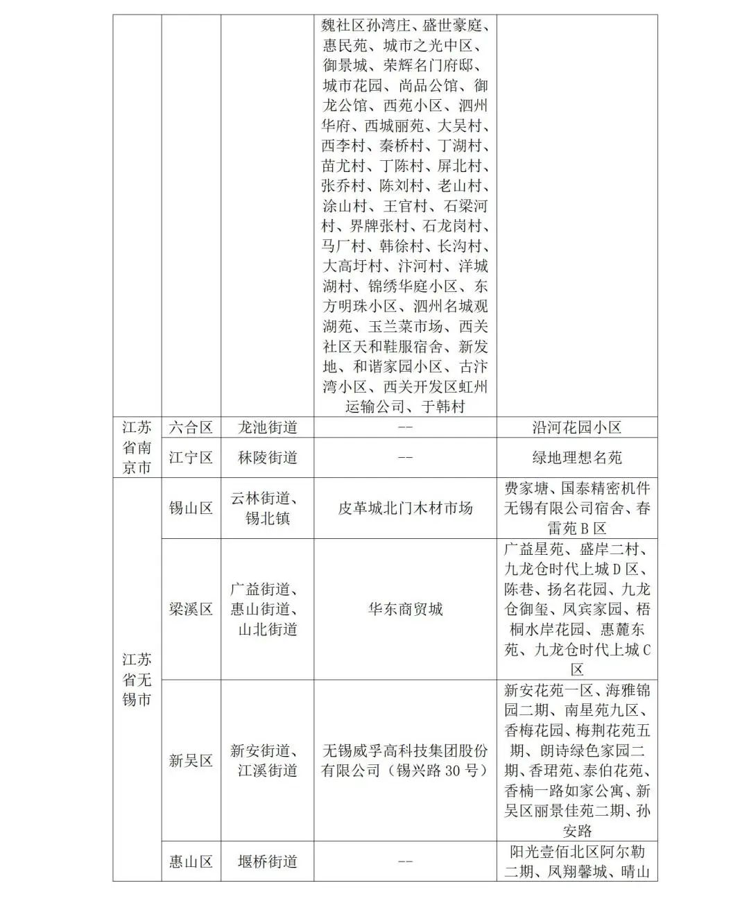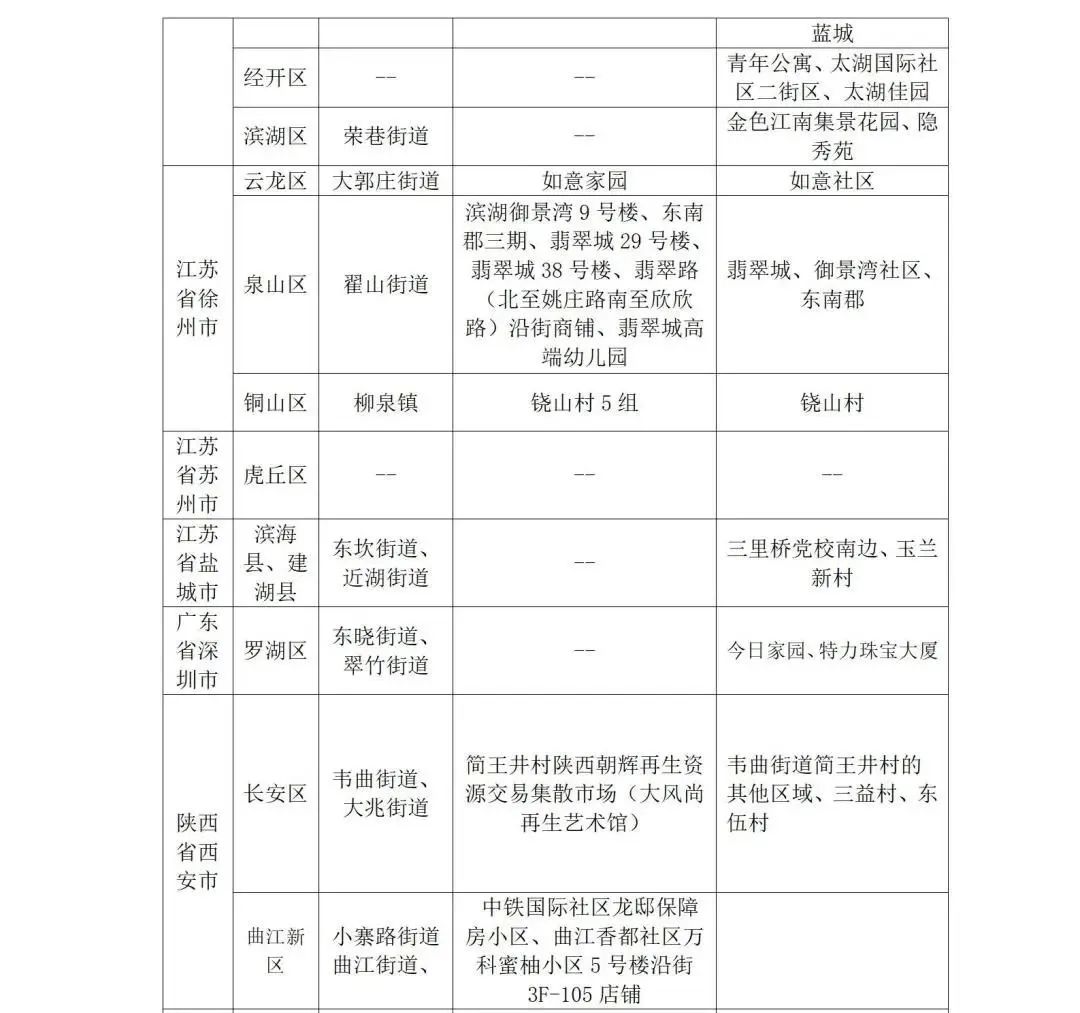 近期以下地区发生本土疫情:1.安徽省宿州市泗县、灵壁县;2.辽宁省丹东市振兴区、振安区、元宝区;3.江苏省徐州市泉山区,南京市六合区,无锡市锡山区、梁锡区、新吴区、惠山区;4.北京市昌平区小汤山镇;5.上海市静安区芷江西路街道、奉贤区金汇镇;6.青岛市黄岛区;7.广东省深圳市福田区、罗湖区;8.西安市长安区;9.天津市武清区;