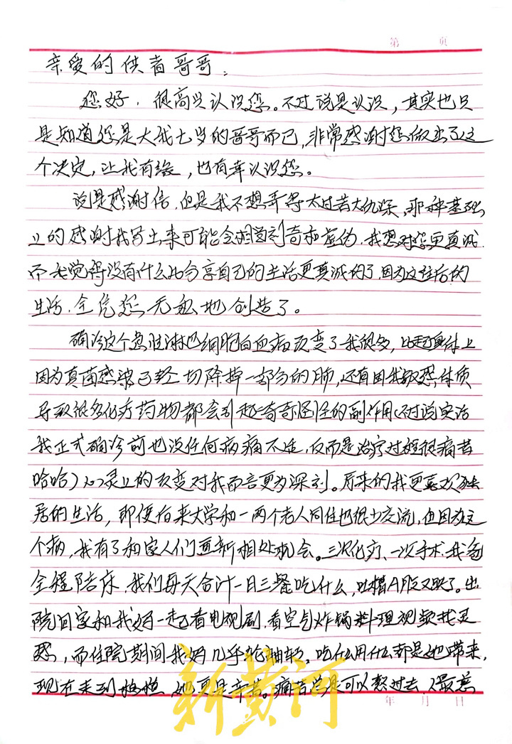 未曾谋面的陌生人,却能主动伸出援手,这让患者极其感动。他给崔开庚写了封信,信中说道,“确诊这个急性淋巴细胞白血病改变了我很多,心灵上的改变对我而言更为深刻,感恩您给我继续体会生命的美好的机会……”