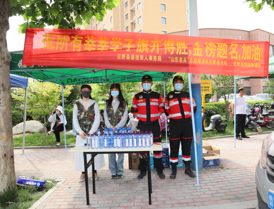 巨野县退役军人事务局组织发动“山东老兵”志愿服务队巨野县大队、巨野特战救援队共16名志愿者,在巨野一中考点外支起了遮阳帐篷,设置了“爱心助力学子”志愿服务站,为考生和家长们准备了矿泉水、风油精、口罩等物资,帮助考生做好考前准备,并为在考场外耐心等待的家长们提供休息、乘凉的地方。志愿者们在交通拥堵路段协助交警指挥交通,疏散拥堵车辆,用实际行动为莘莘学子贡献一份老兵力量。