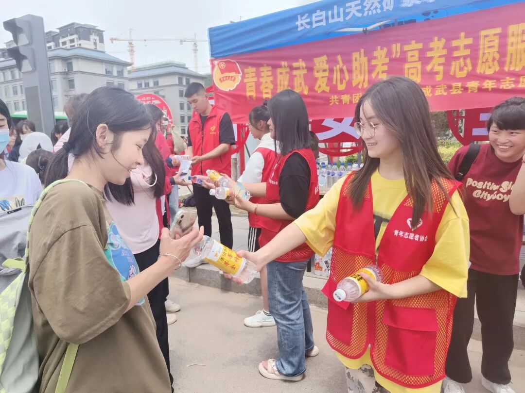 志愿者们在各考点门口搭建“志愿服务帐篷”,为考生和家长提供路线指引服务和医疗服务,并发放中性笔、矿泉水、口罩、藿香正气水等爱心物资,还为在考场外焦急等候的家长和执勤的交警送去了清凉的矿泉水等物品。
