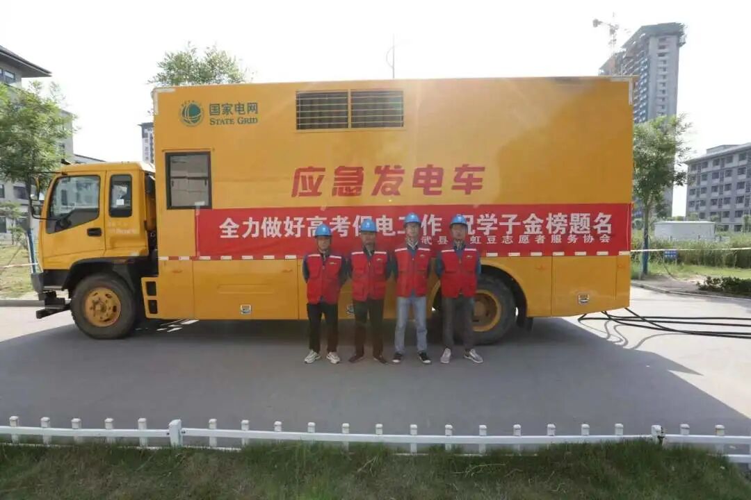 为保障高考期间电力供应,成武县彩虹豆志愿者开展高考电力供应维修工作,彩虹豆志愿者与供电公司派遣的应急发电车,共同进驻各考点现场值守,全力保证设备可靠供电。