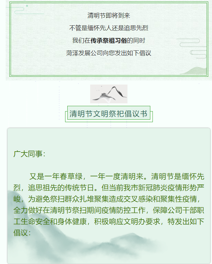 为认真落实落细“外防输入、内防反弹”防控要求,进一步统筹做好疫情防控和文明祭扫工作,积极倡导绿色、简约、文明的祭扫新理念,营造安全有序的祭扫环境,菏泽市中心血站向您发出如下倡议: