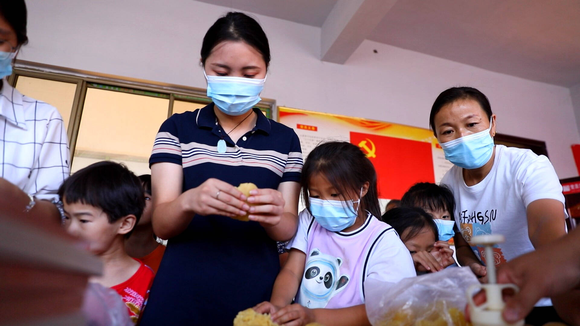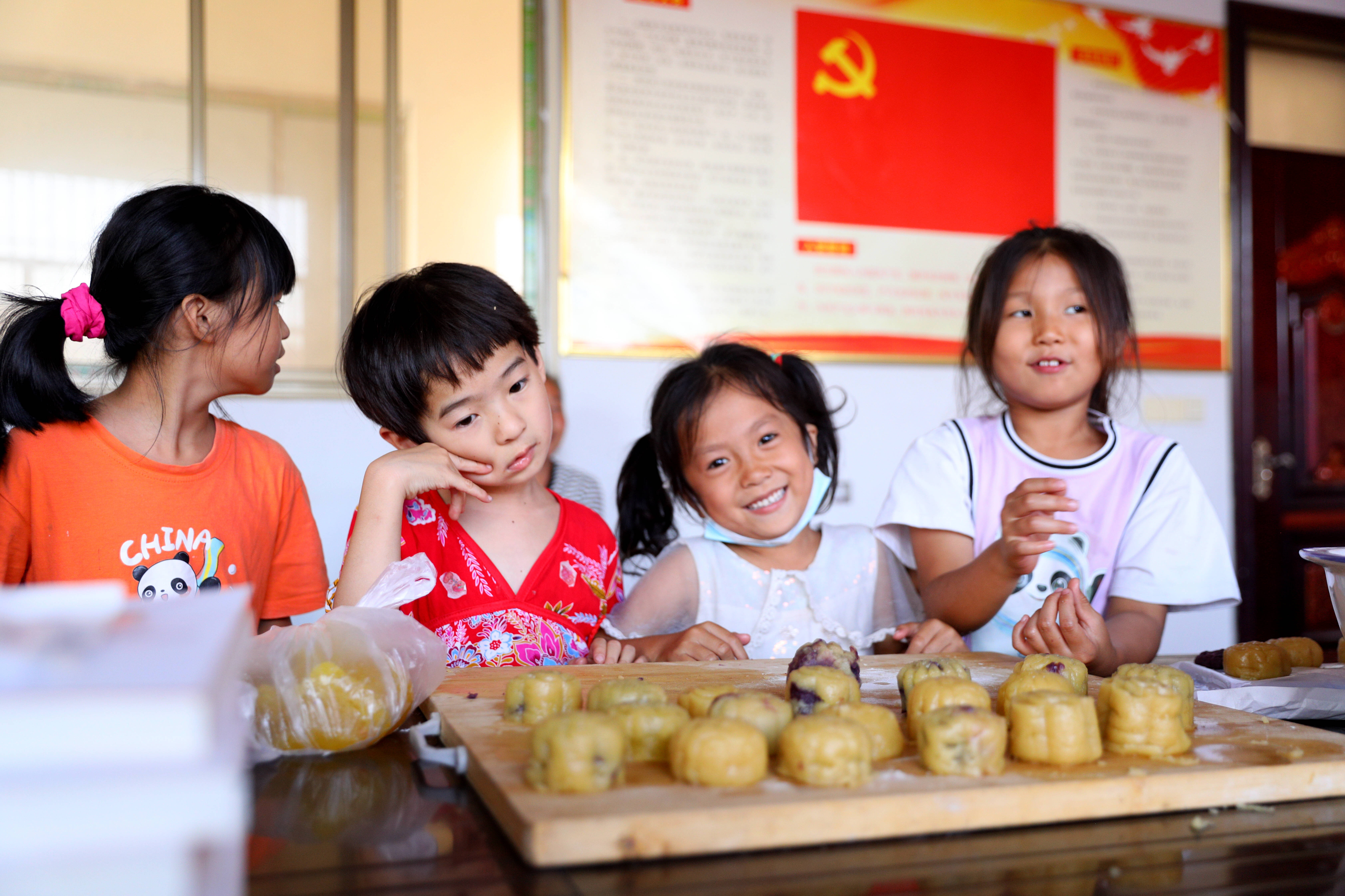 志愿者们将提前准备好的面团、馅料、模具等原材料和工具,发放给来参加活动的村民,向他们讲解了中秋节的传统民俗。现场示范了制作月饼的步骤,并说明了做月饼时需要注意的事项,大家围坐在一起开始动手制作月饼,揉皮、包馅、印形状......一同感受传统民俗文化,迎接中秋佳节。