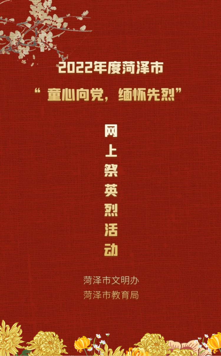 3月30日起,受新冠肺炎疫情影响,菏泽市各中小学校陆续暂停线下教学活动。在清明节期间,为缅怀革命先烈,加强爱国主义教育,菏泽市文明办、菏泽市教育局以“童心向党,缅怀先烈”为主题,开展了2022年“网上祭英烈”网络文明传播活动。