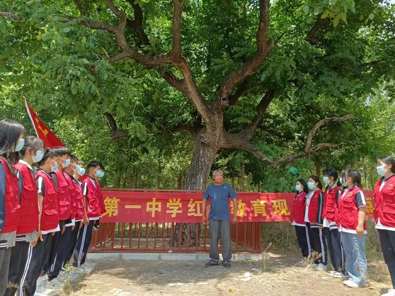 为迎接党的二十大召开,培养青少年学生的爱党、爱国情怀,5月23日,柳林镇第一中学组织部分青少年学生开展了一系列“童心向党,我向党旗敬个礼”的教育实践活动。此次活动主要包括向党旗敬礼、参观李楼村曾见证柳林镇“红五村”抗日斗争的大核桃树、聆听抗战故事、在“五大村抗日反顽纪念碑”前敬礼等。