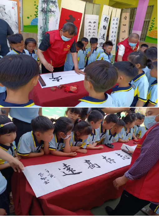 书法是中华民族的文化瑰宝, 是人类文明的宝贵财富。为进一步弘扬中华传统文化,丰富校园文化生活,引导师生感受汉字和书法的魅力。5月30日,在六一儿童节到来之际,李新庄镇开展“情暖六一 关爱成长”新时代文明实践书法进校园活动。