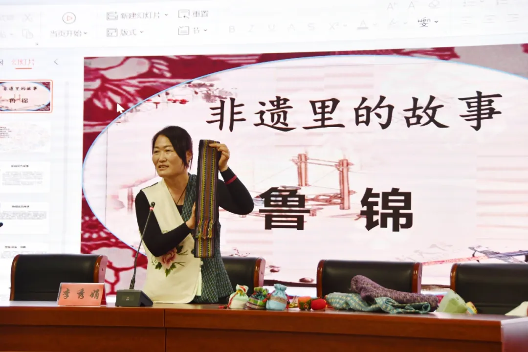 李秀娟还通过PPT“非遗里的故事——鲁锦”向师生们介绍了鲁锦的织造工具,如纺车、织布机等,并现场播放了从棉花到棉线,再到织成布匹的全过程。当看到简单的棉线在织布机上逐渐交织成美丽的图案时,师生们纷纷发出惊叹。