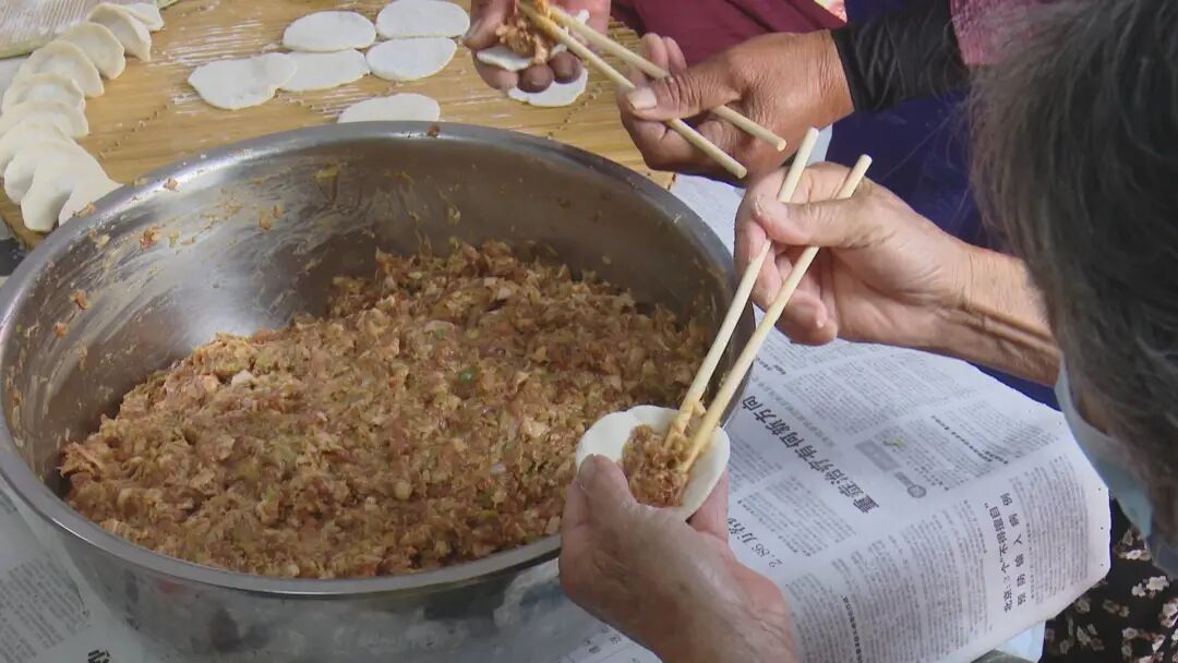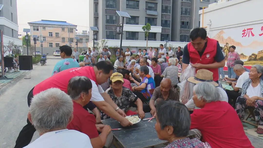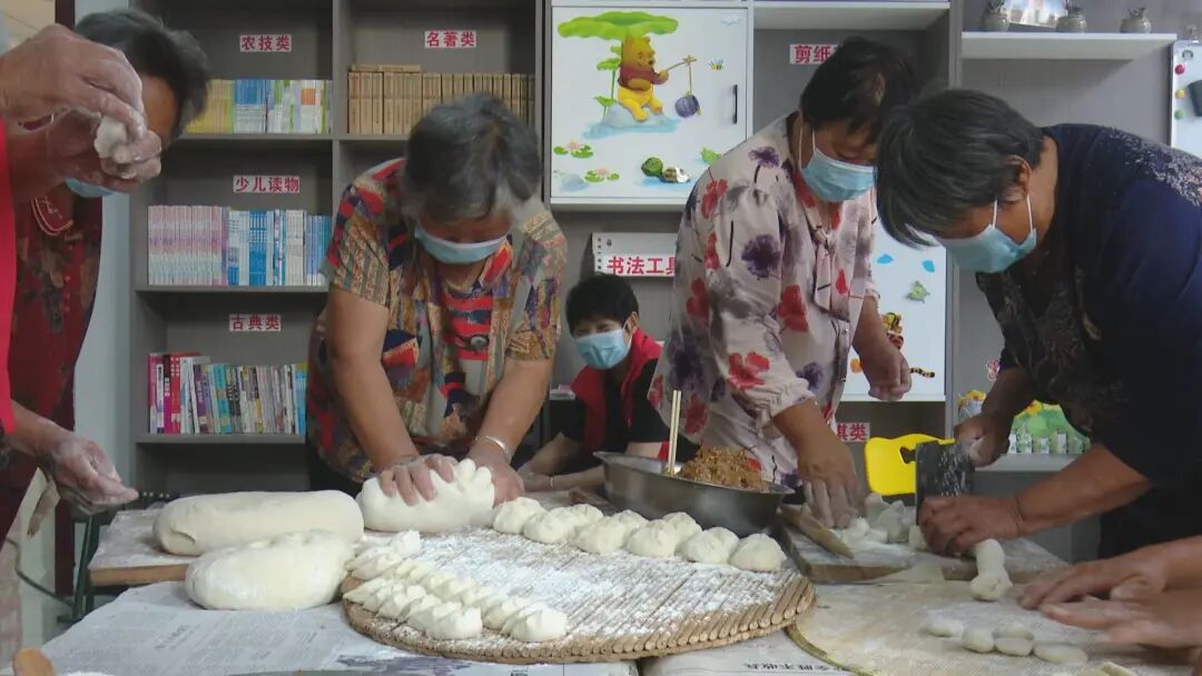 下午六点,在党集镇凤凰社区新时代文明实践站,村里的10余名志愿者聚在一起,你拌馅、我和面、他擀皮,大家一起为社区内的100多位老人包水饺,场面十分热闹忙碌。