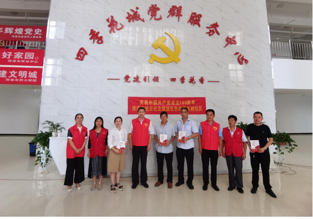 随后,志愿者们细心布置观影活动场地,并在观影前举行了红色书籍《菏泽红色故事》发放仪式,接着向观看电影的社区居民发放了创城宣传页等宣传资料。