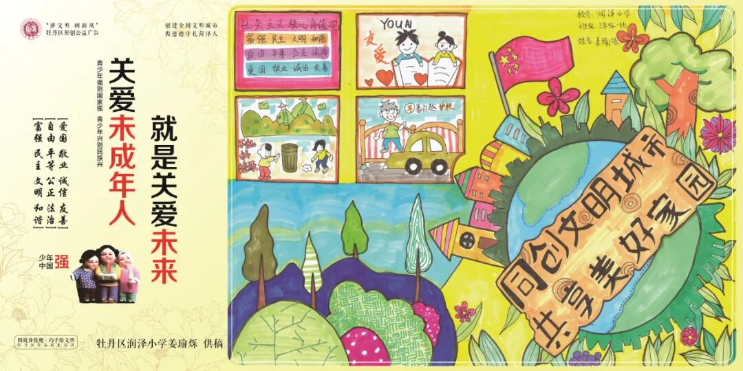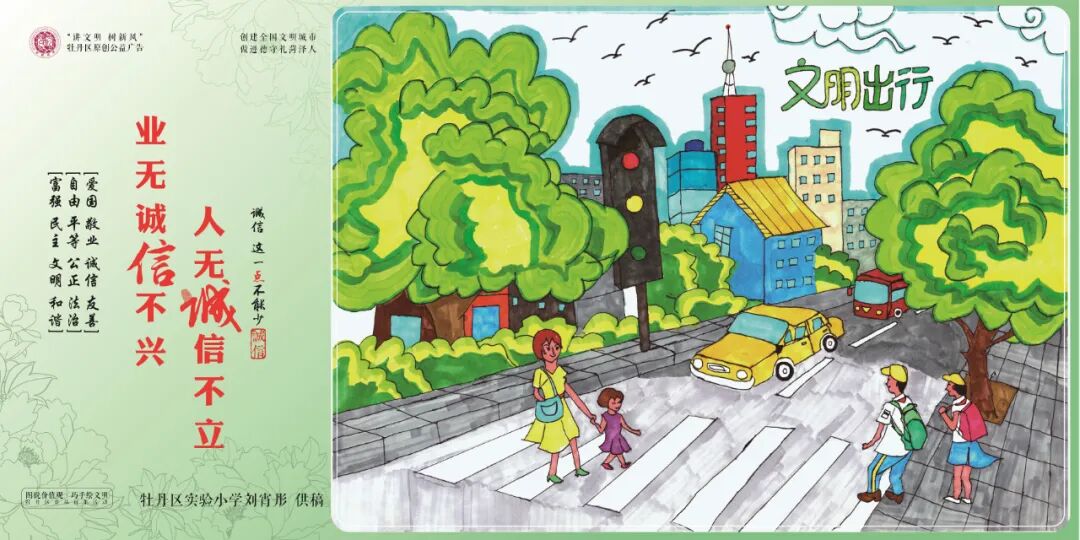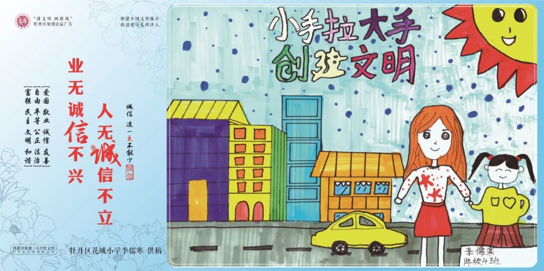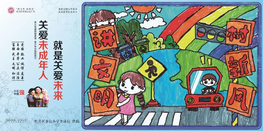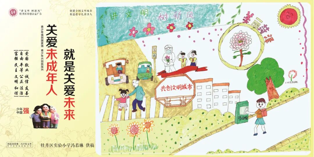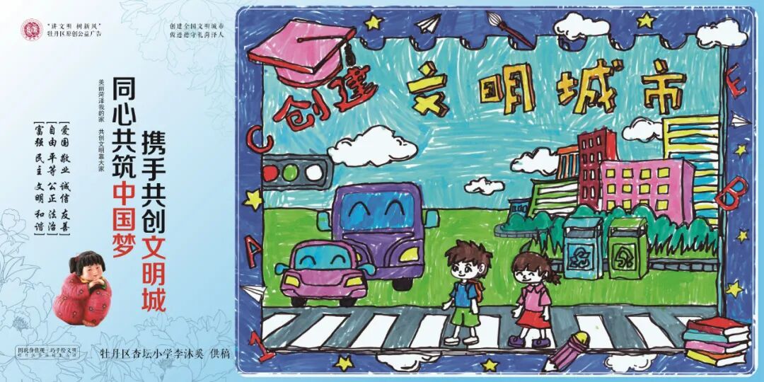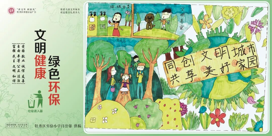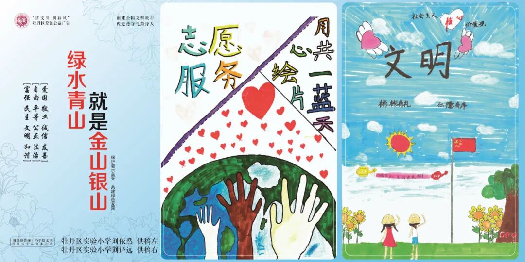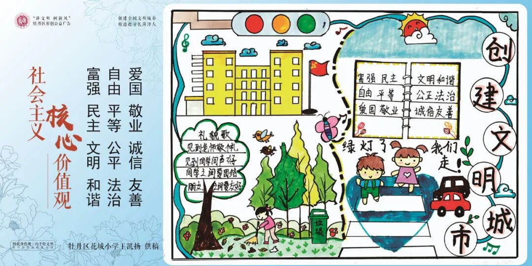 根据同学们的手绘作品,制作系列公益广告,在城区内宣传推广,大家用自己的实际行动当好城市的“文明宣传员”,为我市全国文明城市创建工作增光添彩!