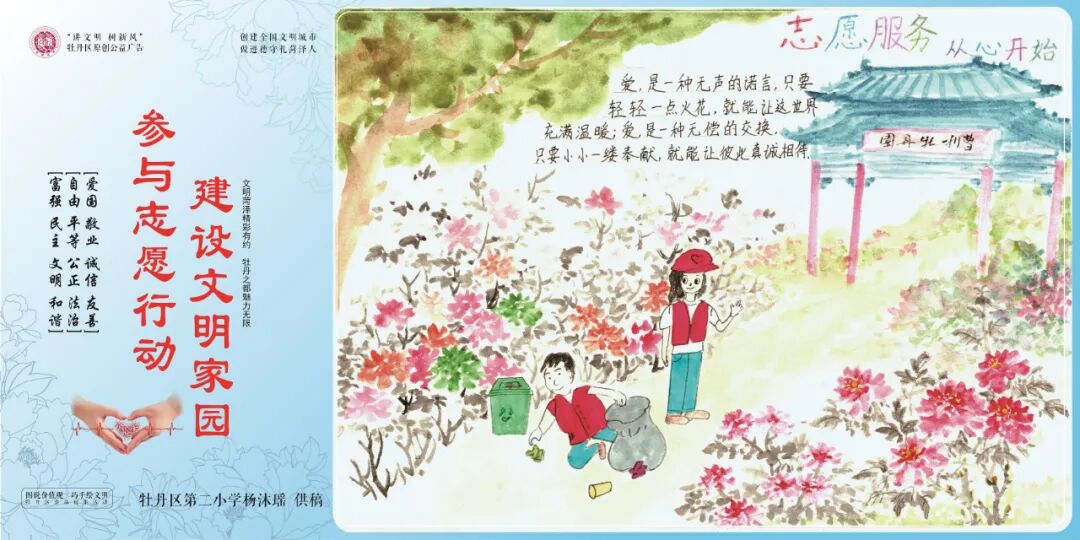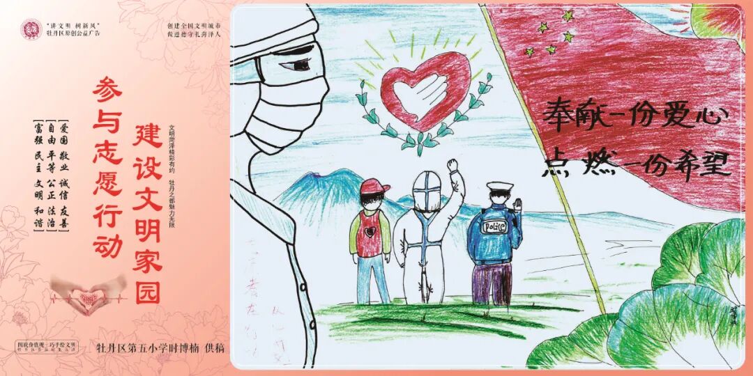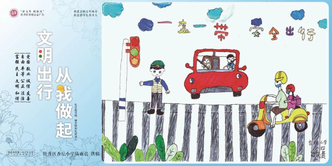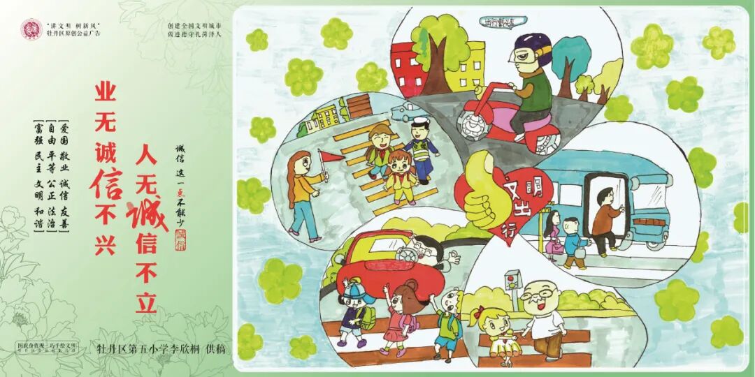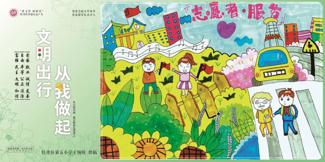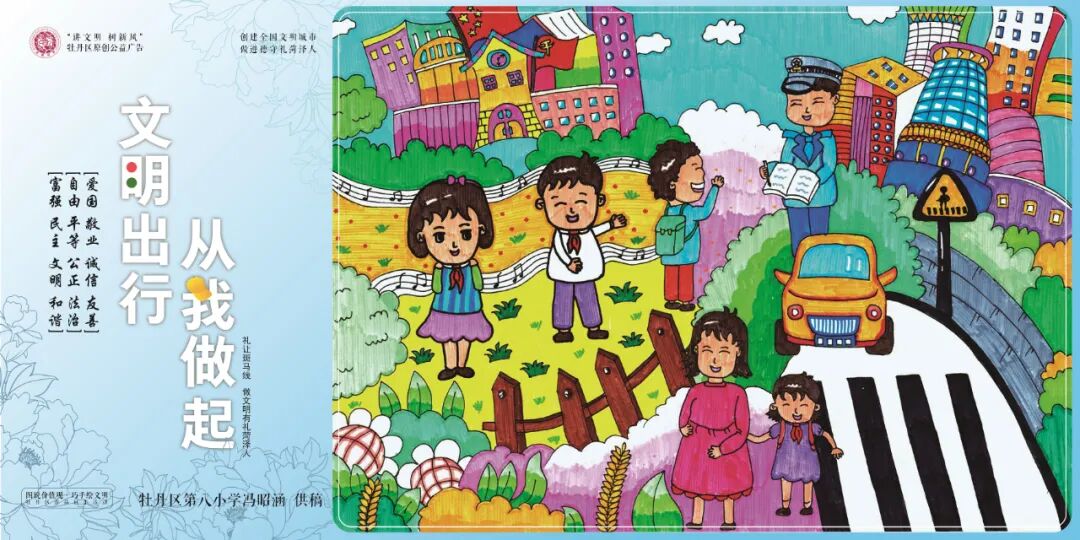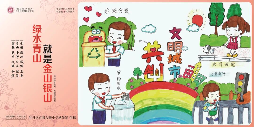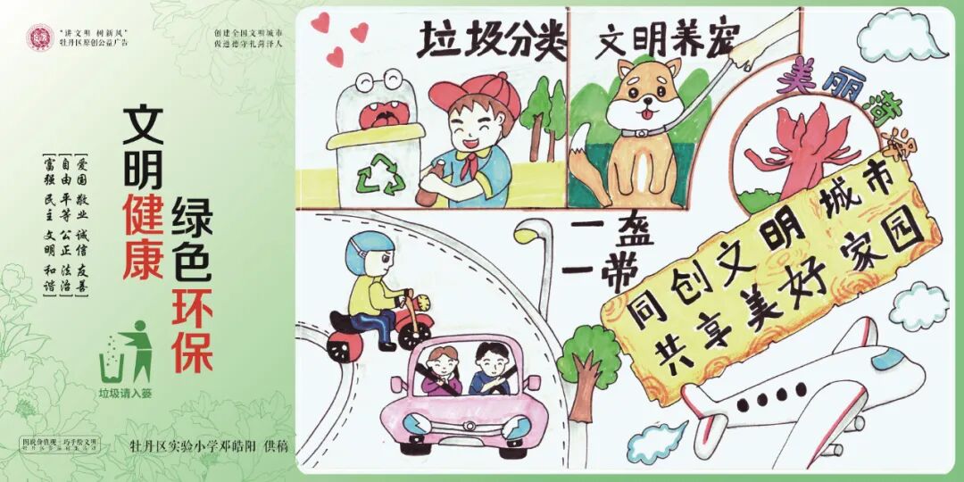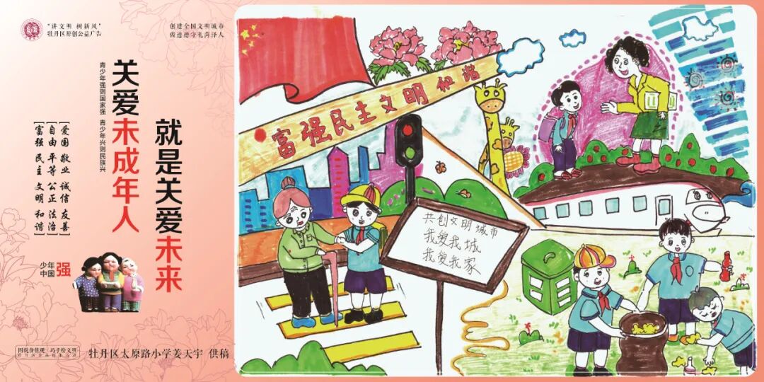 根据同学们的手绘作品,制作系列公益广告,在城区内宣传推广,大家用自己的实际行动当好城市的“文明宣传员”,为我市全国文明城市创建工作增光添彩!