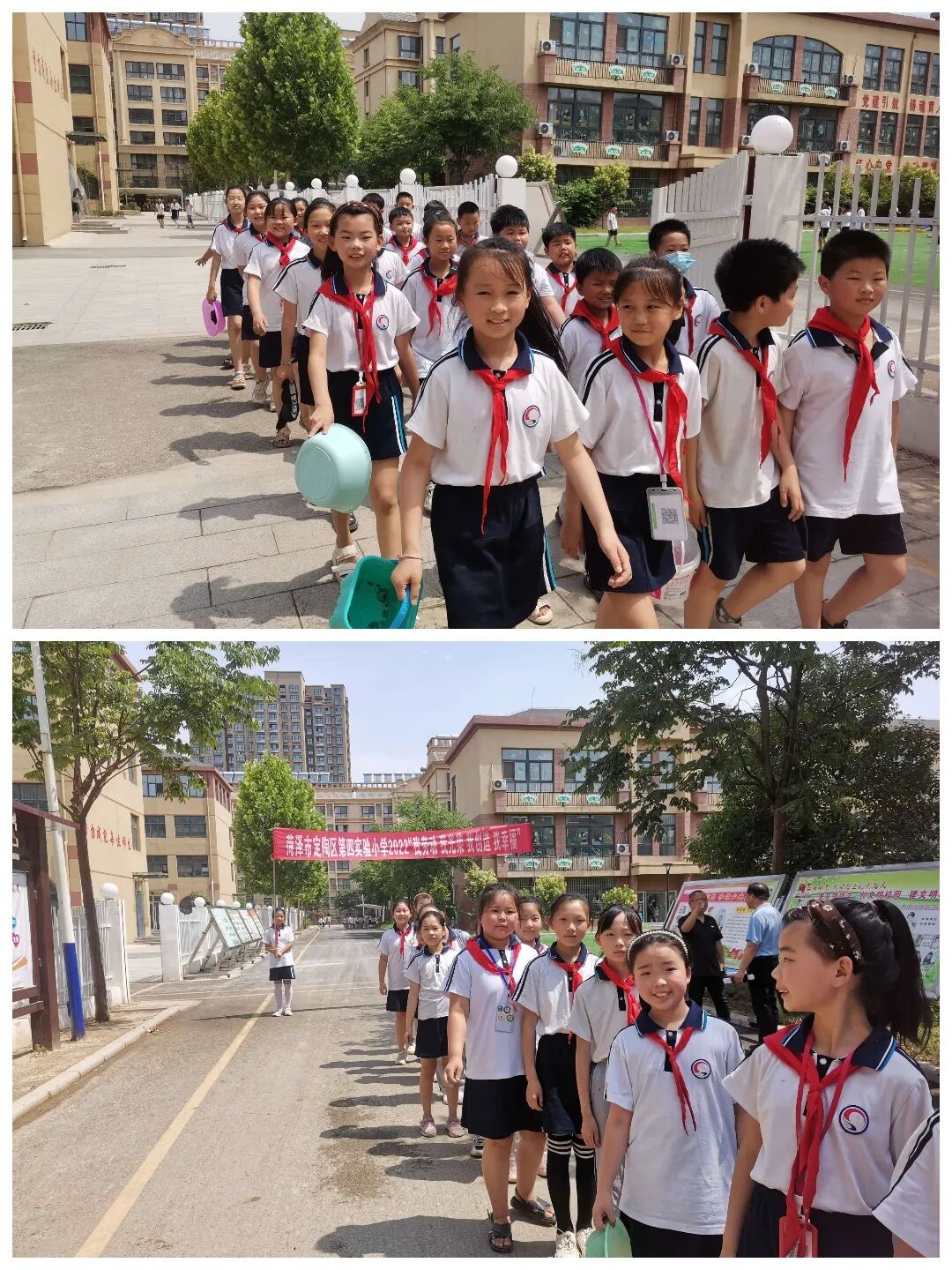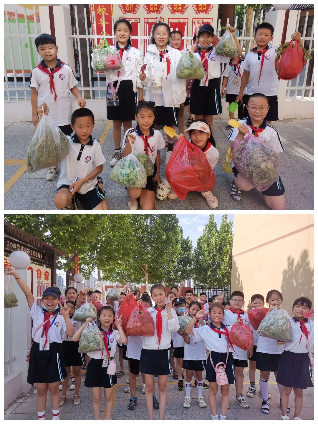 学生自发结成小队,收获果实。艳阳高照,天气炎热,脚沾泥土,挥晒汗水,但没人喊苦喊累,脸上都洋溢着幸福的笑容。