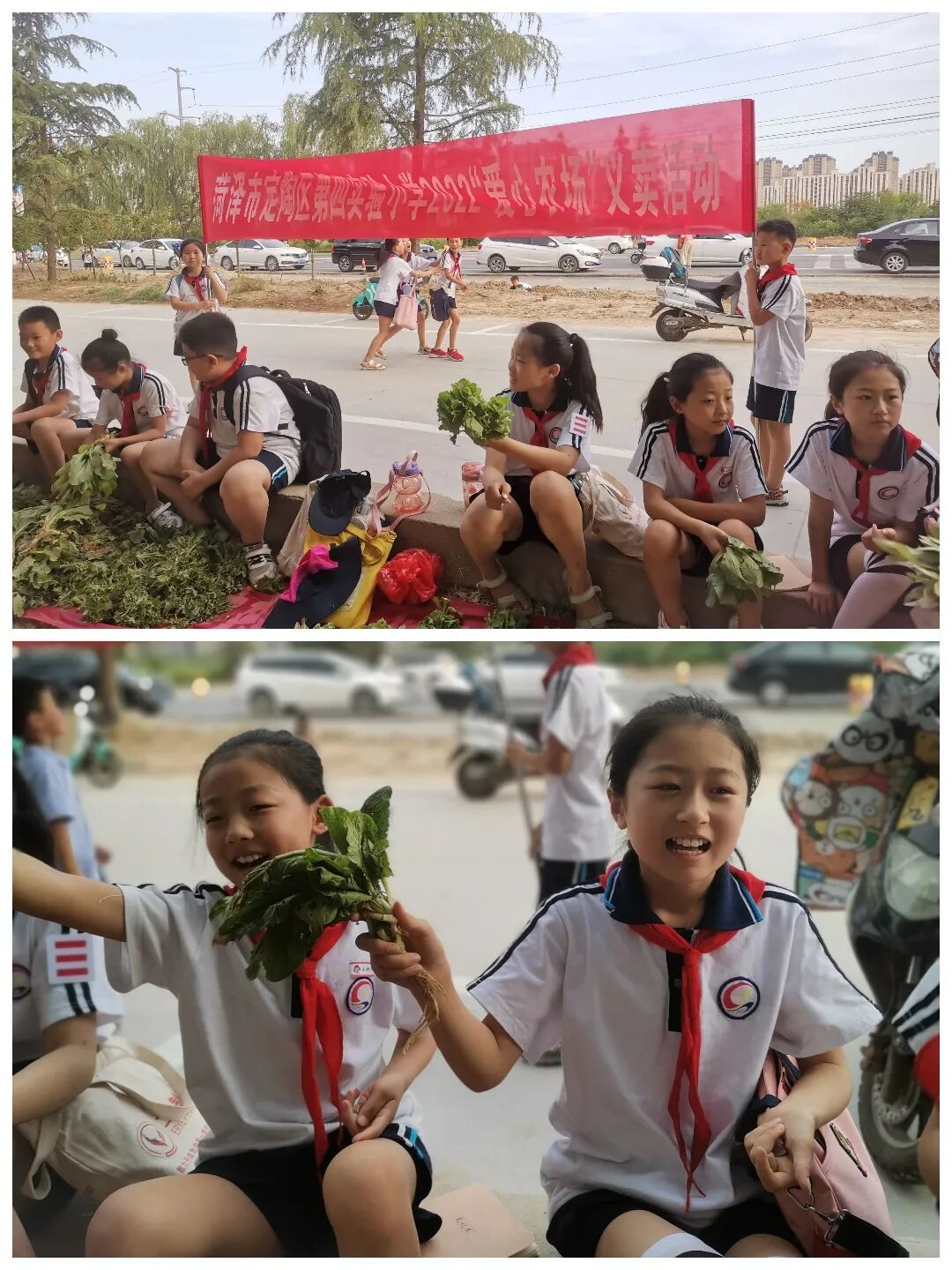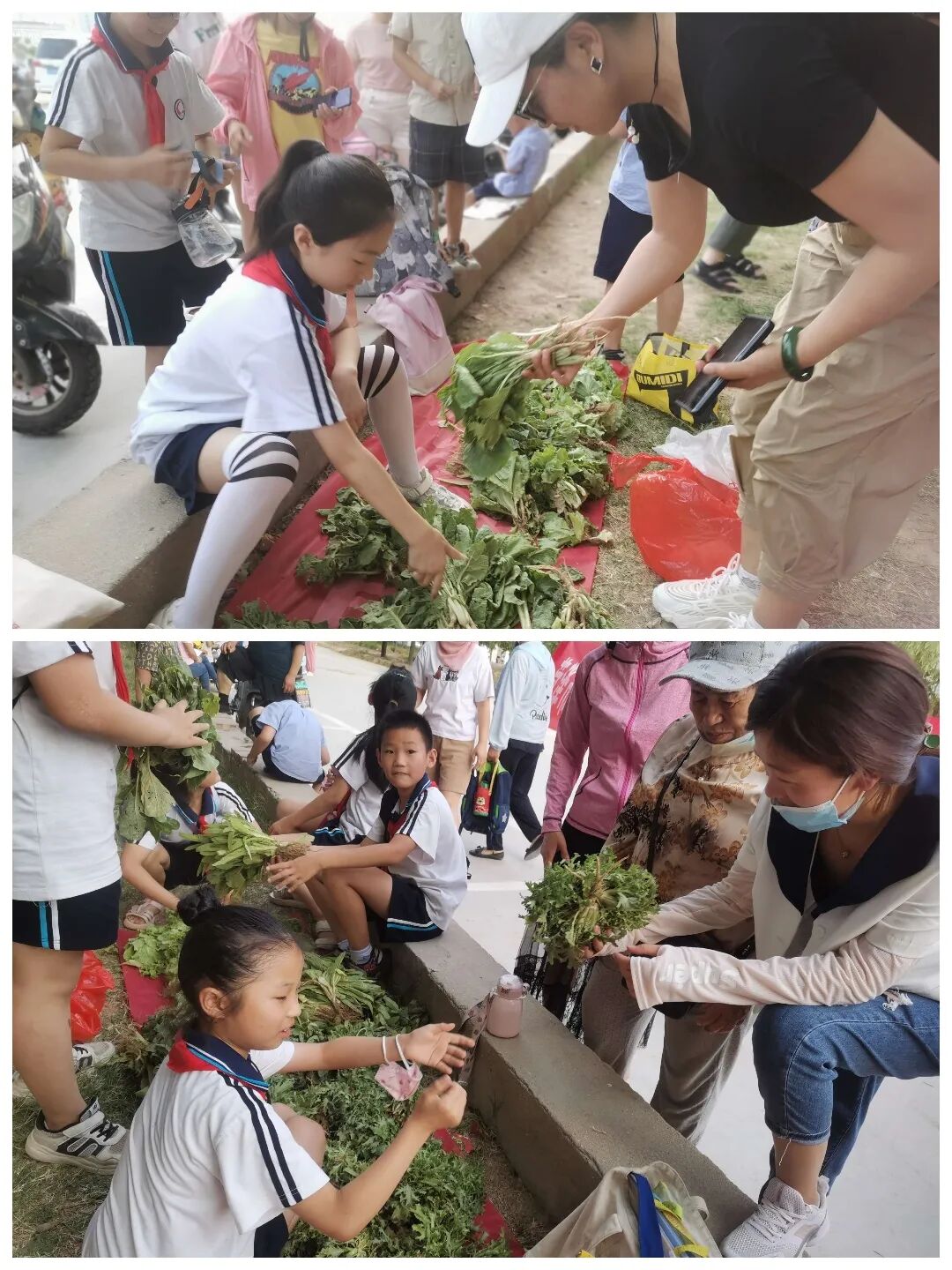 学生分小组将采摘的蔬菜分类扎捆,推选小代表参加义卖活动。所有的喜悦莫过于分享自己的劳动成果,这是一种神奇的体验,它使快乐增大,它使距离缩短,它使情意更浓。