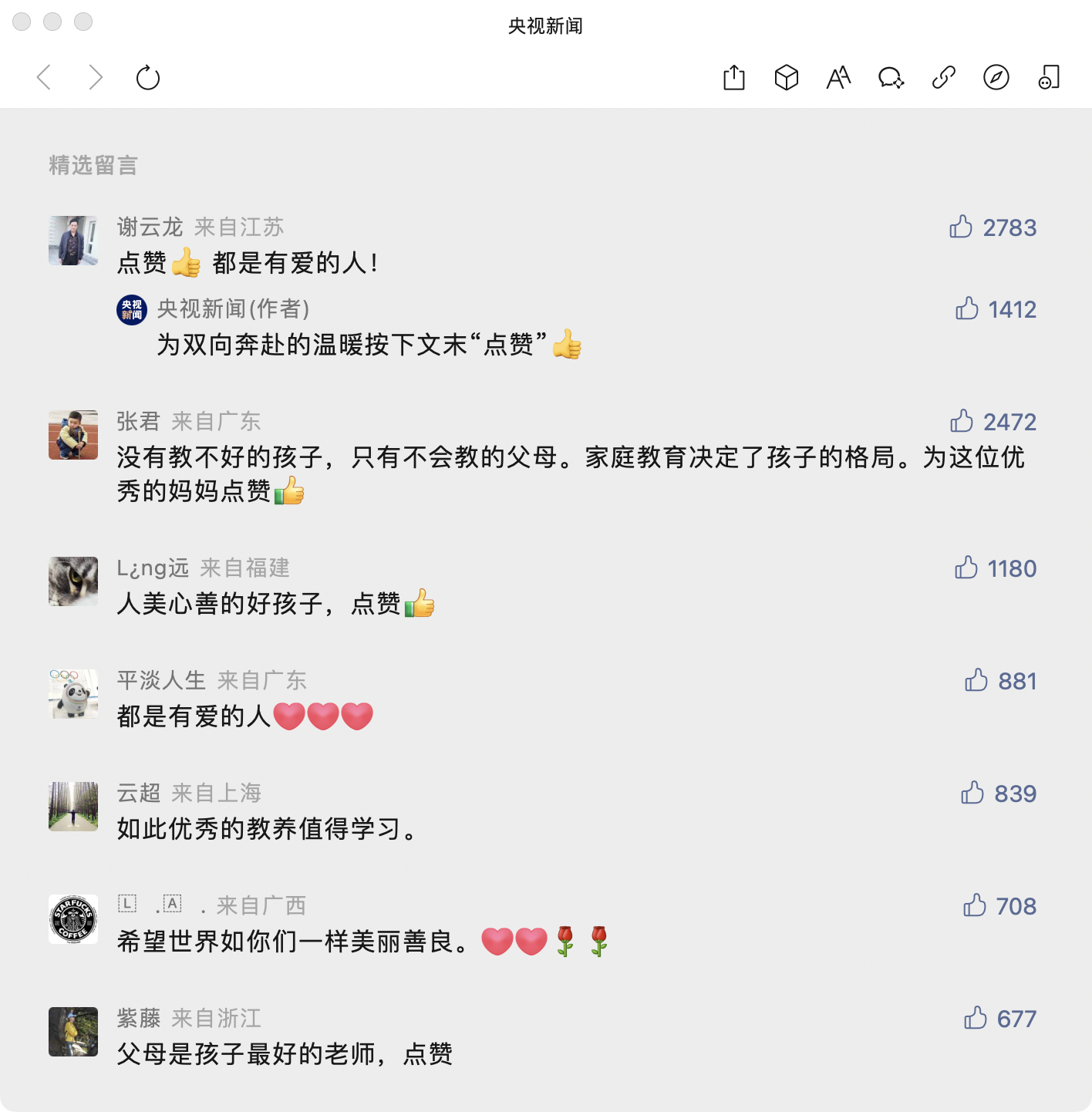 昨晚8时许,新华社微信公众号再次“接力”点赞,来自江苏网友“七月流火”的评论称:“好孩子的背后一定是好家长!点赞!”该评论迅速收获了近3000个点赞。