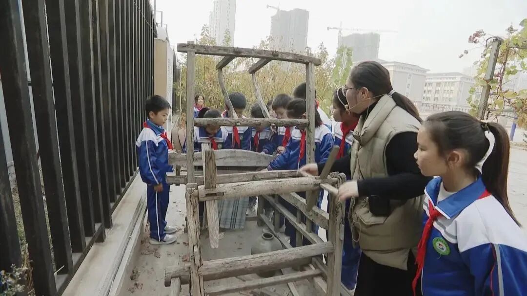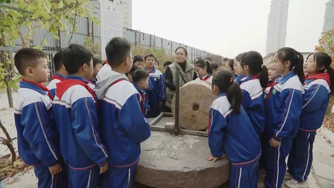 2022年11月15日,在成武县乡村“复兴少年宫”的乡村记忆基地,志愿者正在给孩子们讲解传统劳动工具石碾的用途,孩子们围在志愿者身边听得津津有味。那些只在书本上出现的传统劳动工具被搬到学生的课堂上,孩子们仿佛置身于古老的劳动场景,磨面粉,纺织布匹,让他们感受到了不一样的劳动课程。