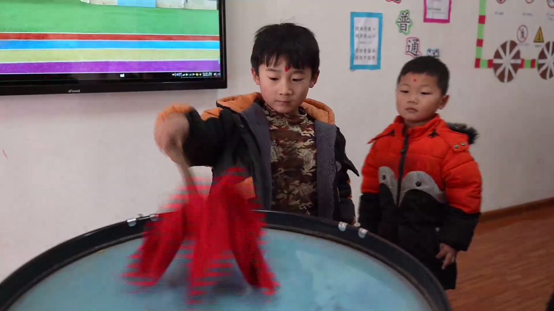 二月二开笔也是传统习俗之一,幼儿园的老师们为孩子们在眉间点上一颗朱砂,祝愿小朋友开启智慧、好好读书。孩子们依次敲响“启志鼓”,寓意击鼓明志。