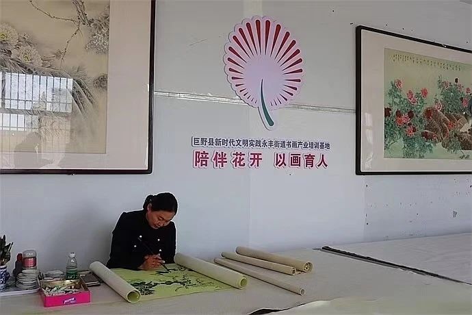 立足浓厚的牡丹书画文化土壤,持续扶持发展书画产业,构建新型产业体系,大力推进书画产业全产业链配套建设,协调推进产业创新、领军人才、领军企业、基层书画院、名家工作室、非遗大师工作室、美术类培训学校、画廊、装裱、篆刻、文创开发及物流配套发展,起到“一业兴振百业”的带动作用,全力打响工笔牡丹画之乡城市名片。目前,巨野县书画产业发展日益繁荣,从业人员达2万人,年创作书画作品可达120余万幅,作品远销40个国家和地区,实现产值超10亿元。