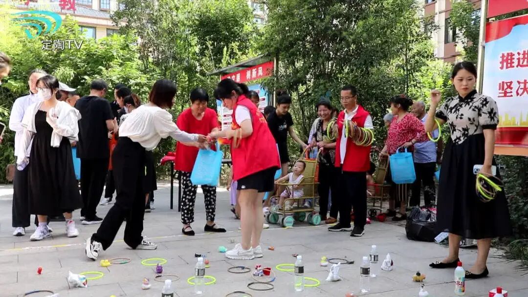 在滨河街道董河社区,现场一片热闹景象。居民们正在赶一场特殊的大集,集市上有套圈、投壶、抢板凳等项目,居民们参加活动就能够赢得各种生活必需品。