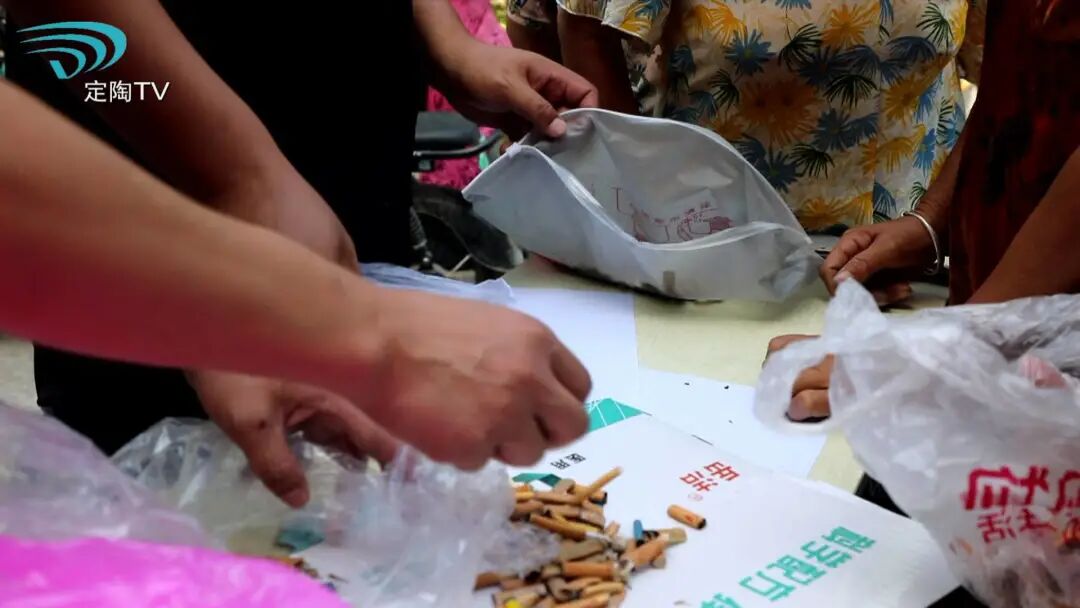 在烟头换鸡蛋的摊位前,居民把自己平时捡的烟头收集起来,拿到这里交给志愿者就能够换取礼品。