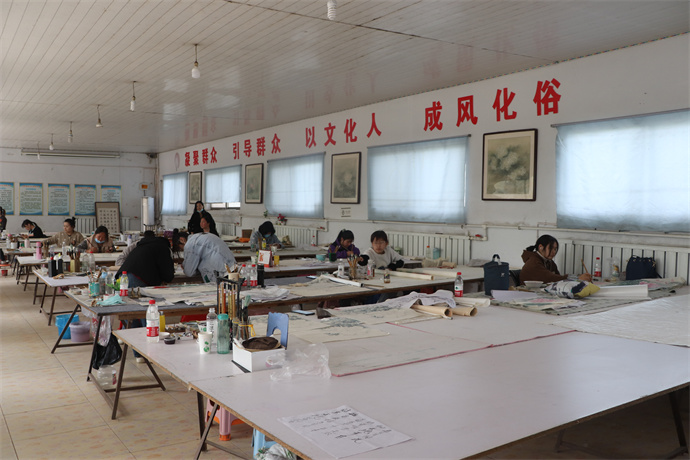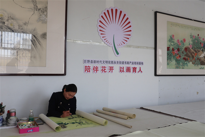 起稿、勾线、上色……两支画笔在手中交替使用,一笔一画、一丝不苟,很快,一朵风姿绰约的牡丹跃然纸上,栩栩如生。“我画工笔画已经十多年了,我家里老人身体不好,还有两个孩子,都需要人照顾,没办法出去打工,在这里画工笔画不仅能赚一点钱,还有时间接送孩子、照顾老人。”田丽丽是巨野县洪庙农民绘画专业合作社的一名画师,大儿子以600多分的成绩考入大学,小儿子也在附近中学上学,每周都可以亲自接回家,而且成绩不错。在乡村中,夫妻两人都出去打工的家庭,孩子往往和老人共同生活,孩子的教育与老人的照顾问题容易被忽视,这也是大力提倡家门口就业的重要原因之一。而巨野县的各乡村书画院在一定程度上让村民实现了家门口就业。以洪庙农民绘画专业合作社为例,仅合作社成员就有510多人,通过洪庙农民绘画专业合作社培训成为画师的人更多。