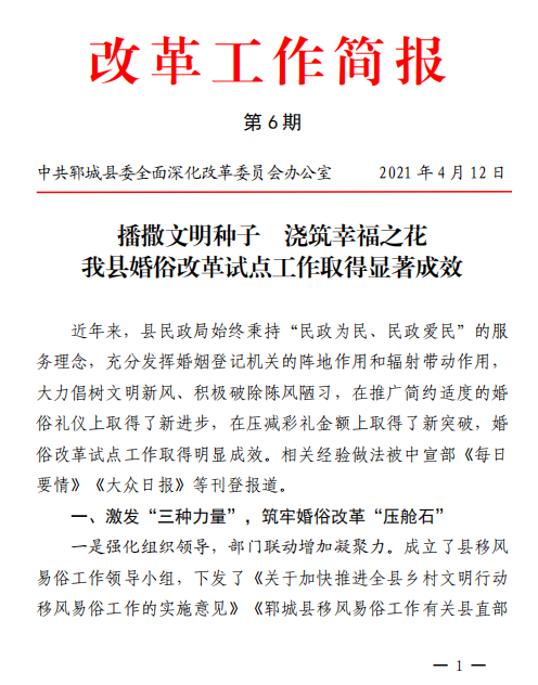 郓城县民政局聚焦乡风文明建设中的热点难点问题,深入开展调研,着力整治高价彩礼、大操大办等陈规陋习,大力倡树新事新办、婚事简办的文明节俭新风尚,在推广简约适度的婚俗礼仪上取得了新进步,在压减彩礼金额上取得了新突破,省级婚俗改革试点工作取得阶段性显著成效。
