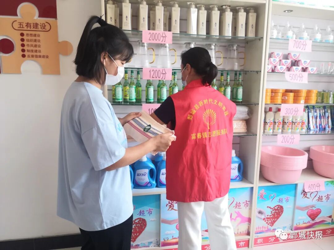 积分超市设置在富春镇新时代文明实践所内,积分超市内设置了志愿服务积分兑换区,结合群众需求配置10多种生活日用品,明码标分,自由兑换,志愿者们可根据参与志愿服务的积分情况,用积分兑换不同价值的丰富物品。