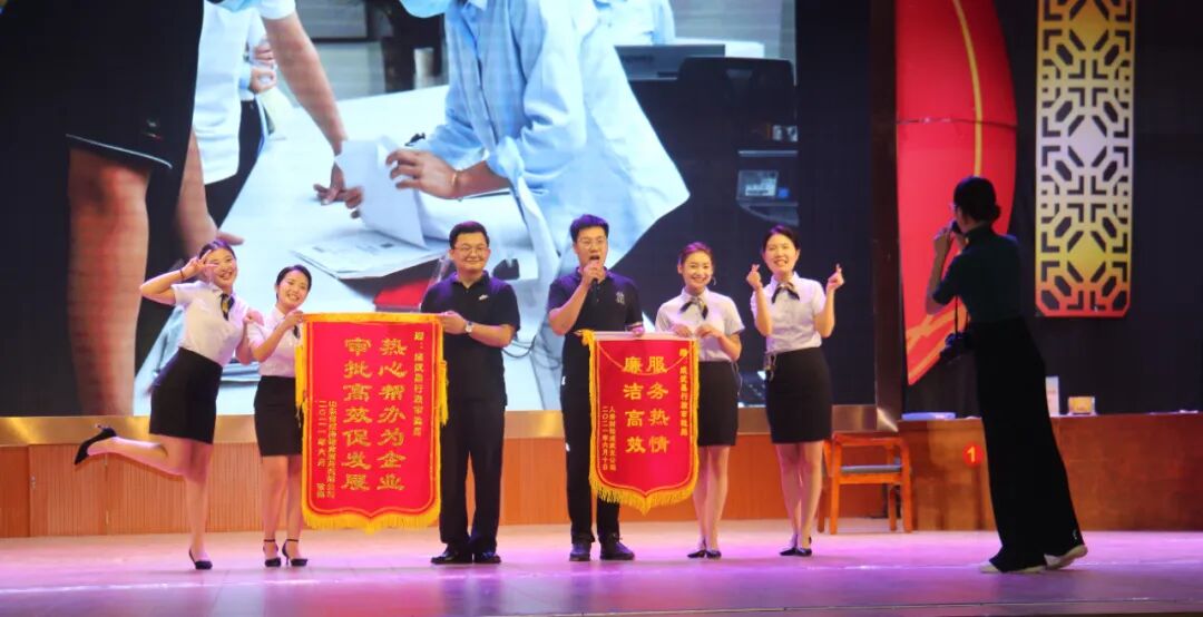 县委县直机关工委副书记田凤阁为荣获二等奖的山东达驰文亭湖大酒店有限公司代表队、成武县行政审批服务局代表队、中国邮政集团公司山东省成武县分公司代表队颁奖。