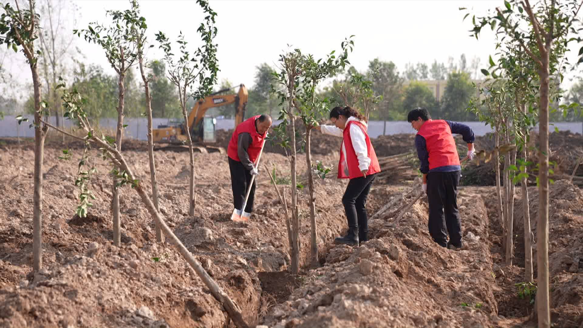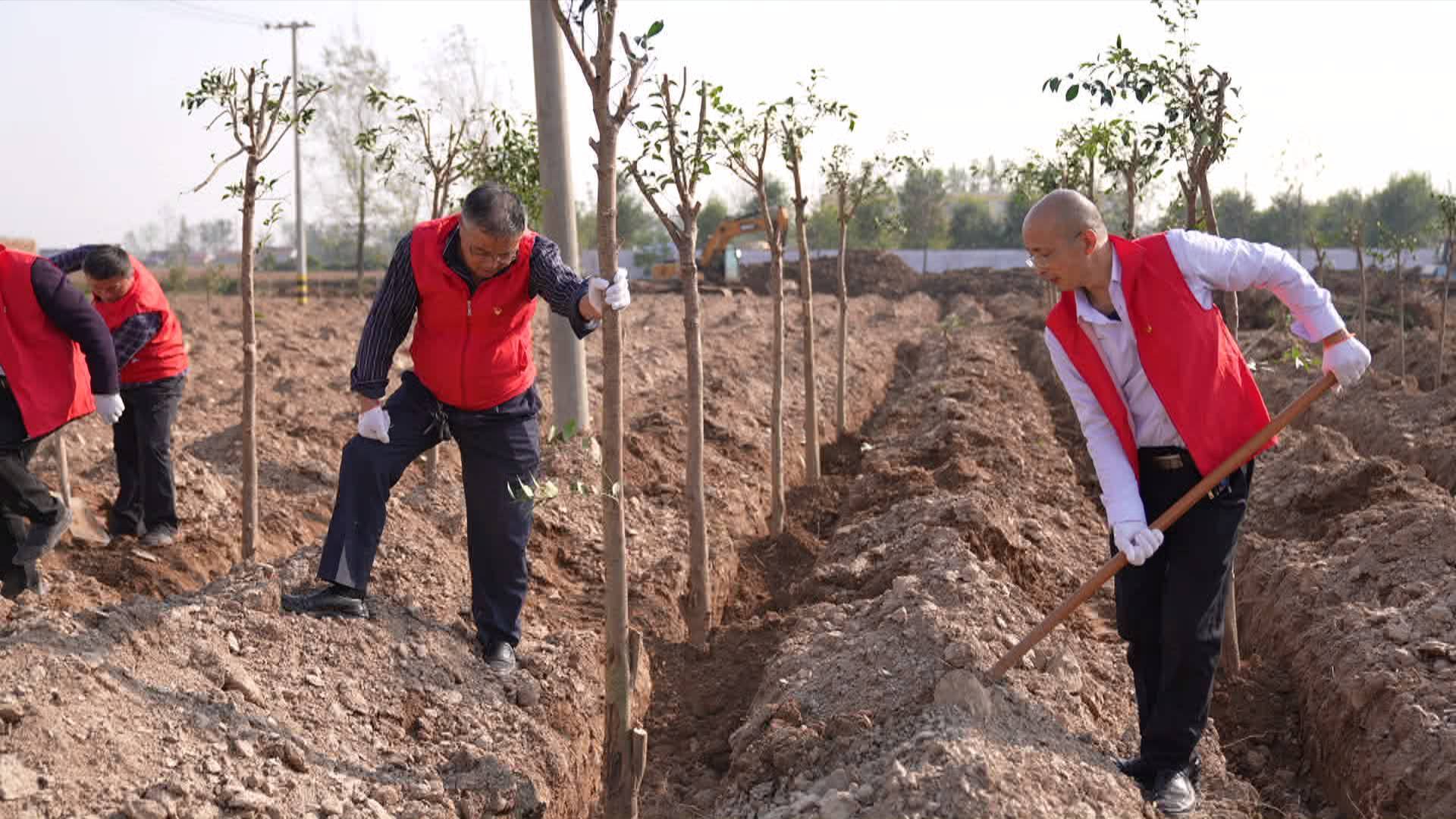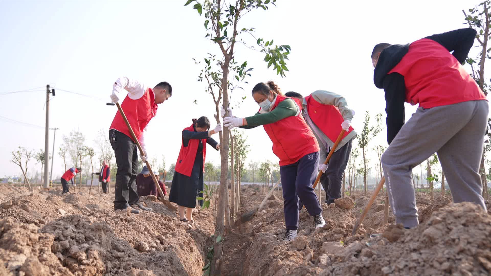 在杜堂镇孙庄村,一派热火朝天的繁忙景象,部分党员及群众正在开展秋季植树造林活动。活动中,大家严格按照株间距、行间距、“三埋、两踩、一轻提”的要求,严把造林质量,提高苗木成活率,让植树造林工作保成效、见绿色、结硕果。